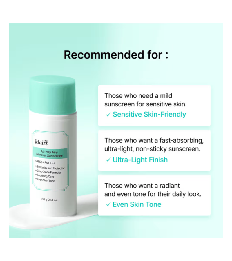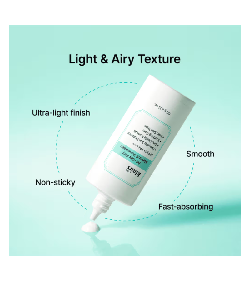 GET DIRECTIONAll-Day Airy Mineral Sunscreen SPF50+ PA++++ (60g) This lightweight mineral sunscreen delivers broad-spectrum protection with SPF50+ and PA++++ rating, shielding your skin from UVA and UVB rays. Formulated with airy, breathable technology, it absorbs quickly without leaving a heavy residue or white cast, making it ideal for daily wear under makeup or alone. The 60g size provides ample coverage for consistent sun protection throughout your day. Mineral-based ingredients work gently on all skin types, including sensitive skin, while maintaining a comfortable, non-greasy finish that won't clog pores.