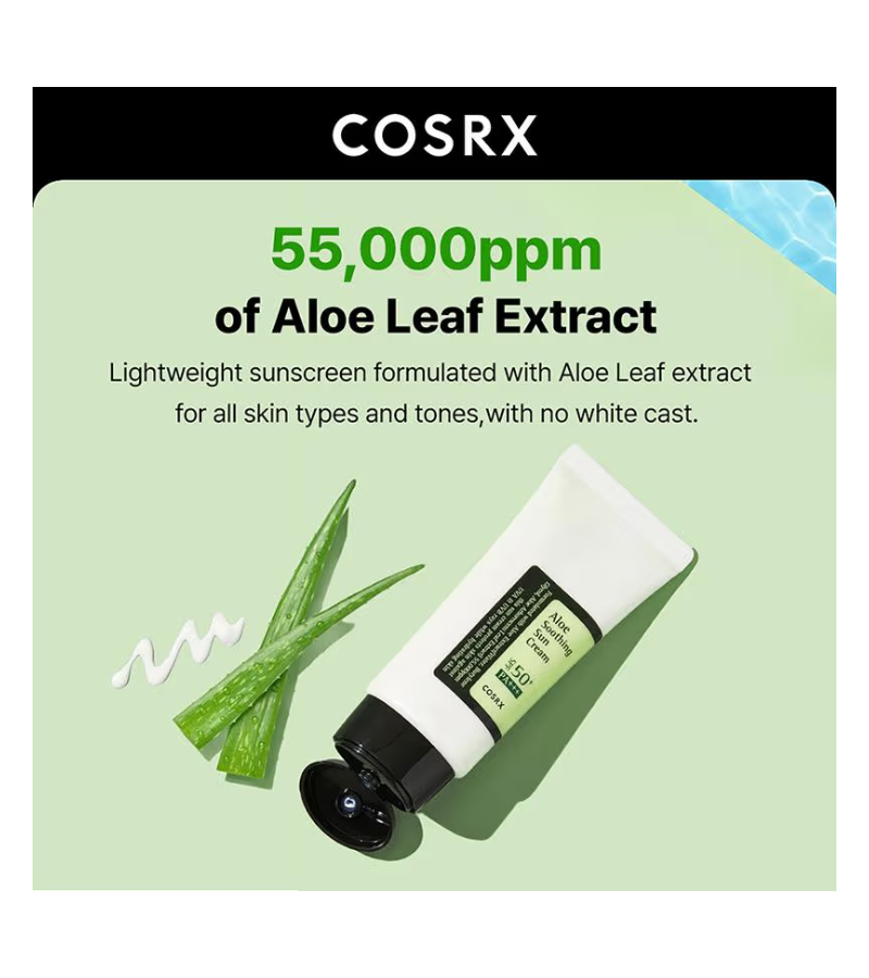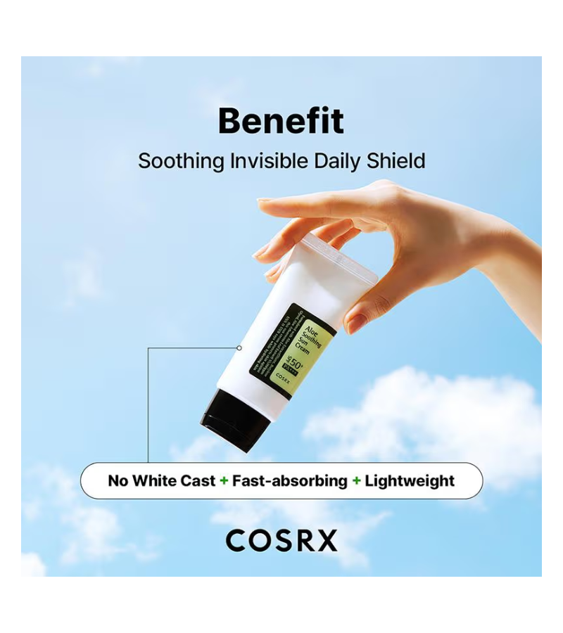 GET DIRECTIONCOSRX Aloe Soothing Sun Cream delivers broad-spectrum UV protection with SPF 50+ PA+++ in a lightweight, hydrating formula. Infused with aloe vera extract, this 50ml sun cream soothes and moisturizes while creating a protective barrier against UVA and UVB rays. The non-greasy texture absorbs quickly, making it ideal for daily facial use. Perfect for sensitive or irritated skin, it combines efficacy with comfort for year-round sun defense.