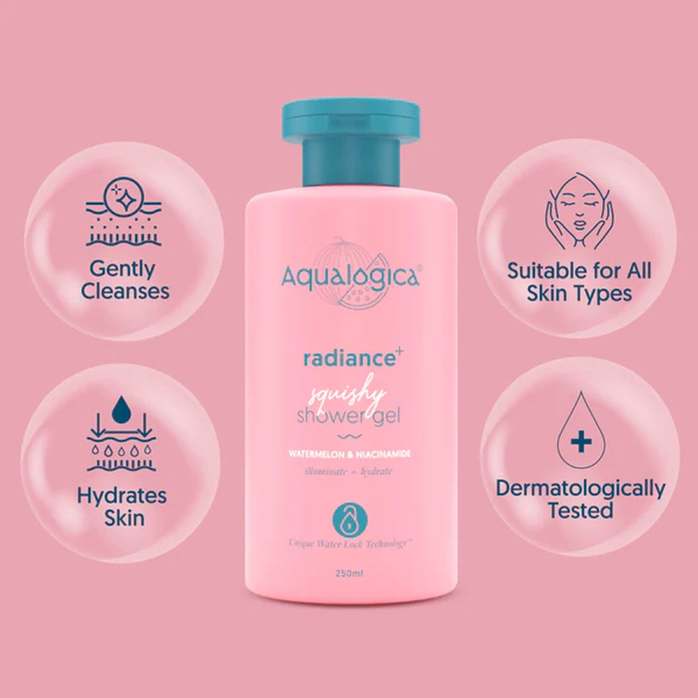 Aqualogica Radiance+ Squishy Shower Gel (250ml) gently cleanses the skin while enhancing its natural glow. Its lightweight, squishy texture ensures a rich lather that removes impurities without stripping moisture. Ideal for daily use, this shower gel leaves your skin feeling refreshed, hydrated, and radiant. Formulated to maintain skin balance, it promotes a smooth, soft touch and a revitalized appearance with every wash.