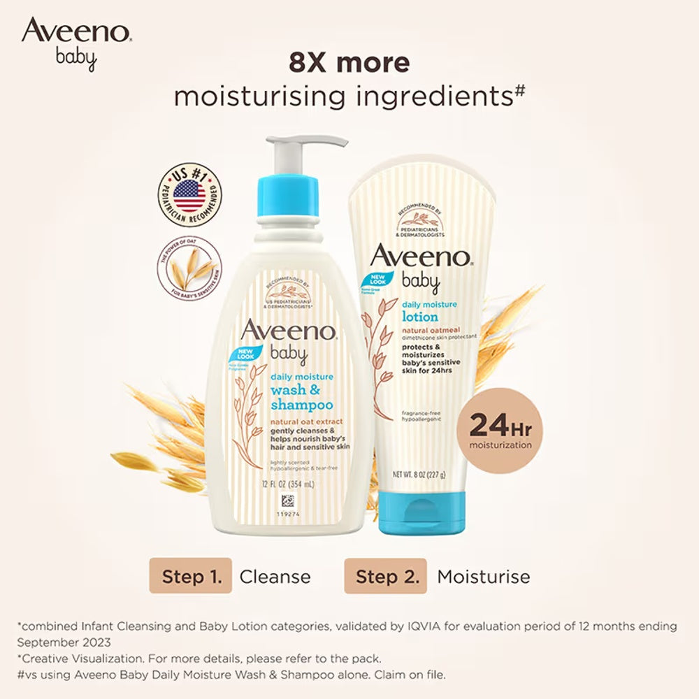 Aveeno Baby Daily Moisturizing Lotion & Wash Shampoo Combo is designed specifically for dry, itchy, and sensitive skin. This gentle formula combines natural oat extracts to soothe and nourish delicate skin while cleansing effectively without irritation. The lotion provides lasting hydration and helps restore the skin’s natural barrier, making it ideal for daily use on babies prone to dryness and sensitivity. The wash shampoo gently cleanses both hair and skin, minimizing discomfort and maintaining softness. Perfect for parents seeking expert-approved, soothing care for their baby's delicate skin needs.