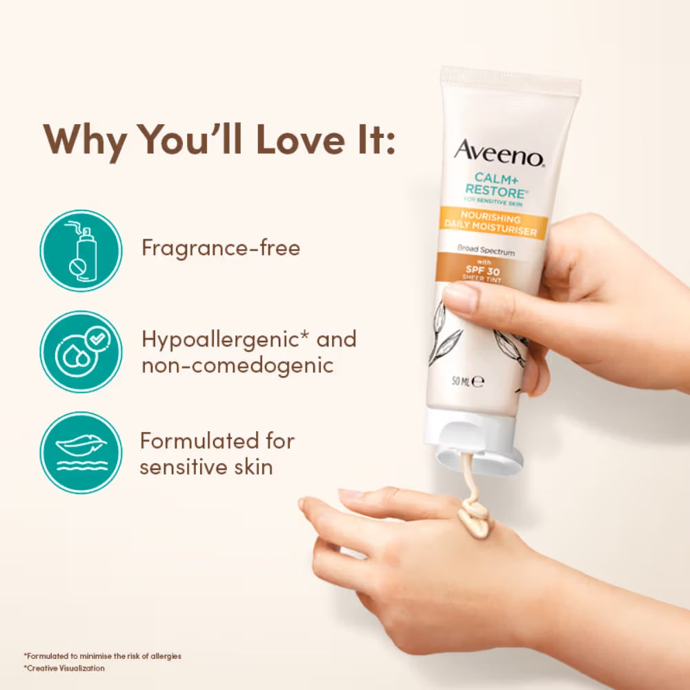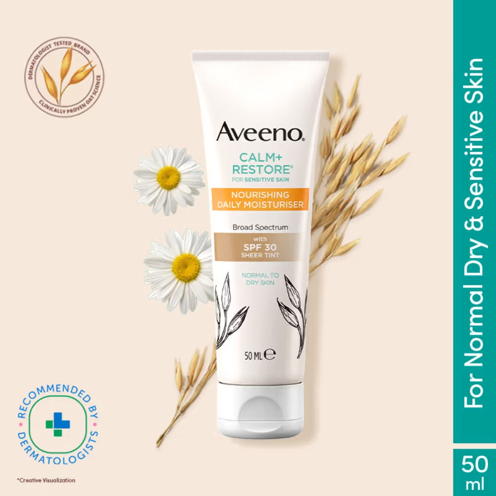 Aveeno Calm + Restore Tinted Moisturizer Sunscreen SPF30 is specially formulated for dry, sensitive skin, providing gentle yet effective daily protection. This dermatologist-recommended product combines soothing ingredients with broad-spectrum SPF30 to shield skin from harmful UV rays while calming redness and irritation. Its lightweight, tinted formula evens skin tone and hydrates deeply, making it an ideal choice for sensitive skin needing both moisture and sun defense in one expert solution.