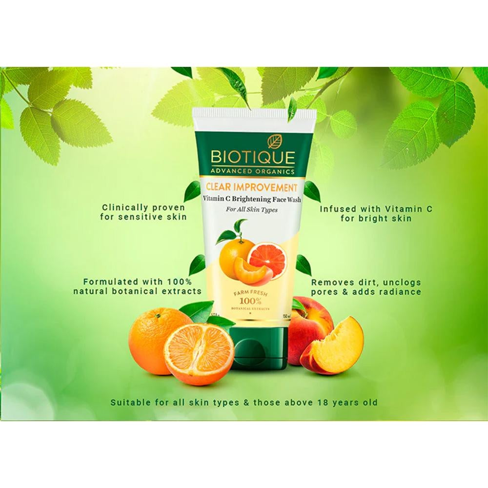 Biotique Clear Improvement Vitamin C Brightening Face Wash (150ml) gently cleanses while infusing skin with vitamin C to brighten and even out complexion. This formulation helps reduce dullness and revitalizes skin for a fresh, radiant look. Ideal for daily use, it nourishes without stripping moisture, supporting a clearer, healthier appearance.