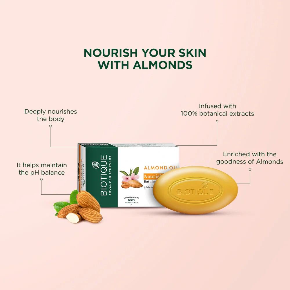 BIOTIQUE Almond Oil Nourishing Bathing Bar combines the moisturizing benefits of almond oil with natural ingredients to gently cleanse and nourish your skin. This bathing bar helps maintain skin hydration, leaving it soft, smooth, and revitalized after every wash. Ideal for daily use, it supports healthy skin balance without harsh chemicals, promoting a naturally radiant complexion.