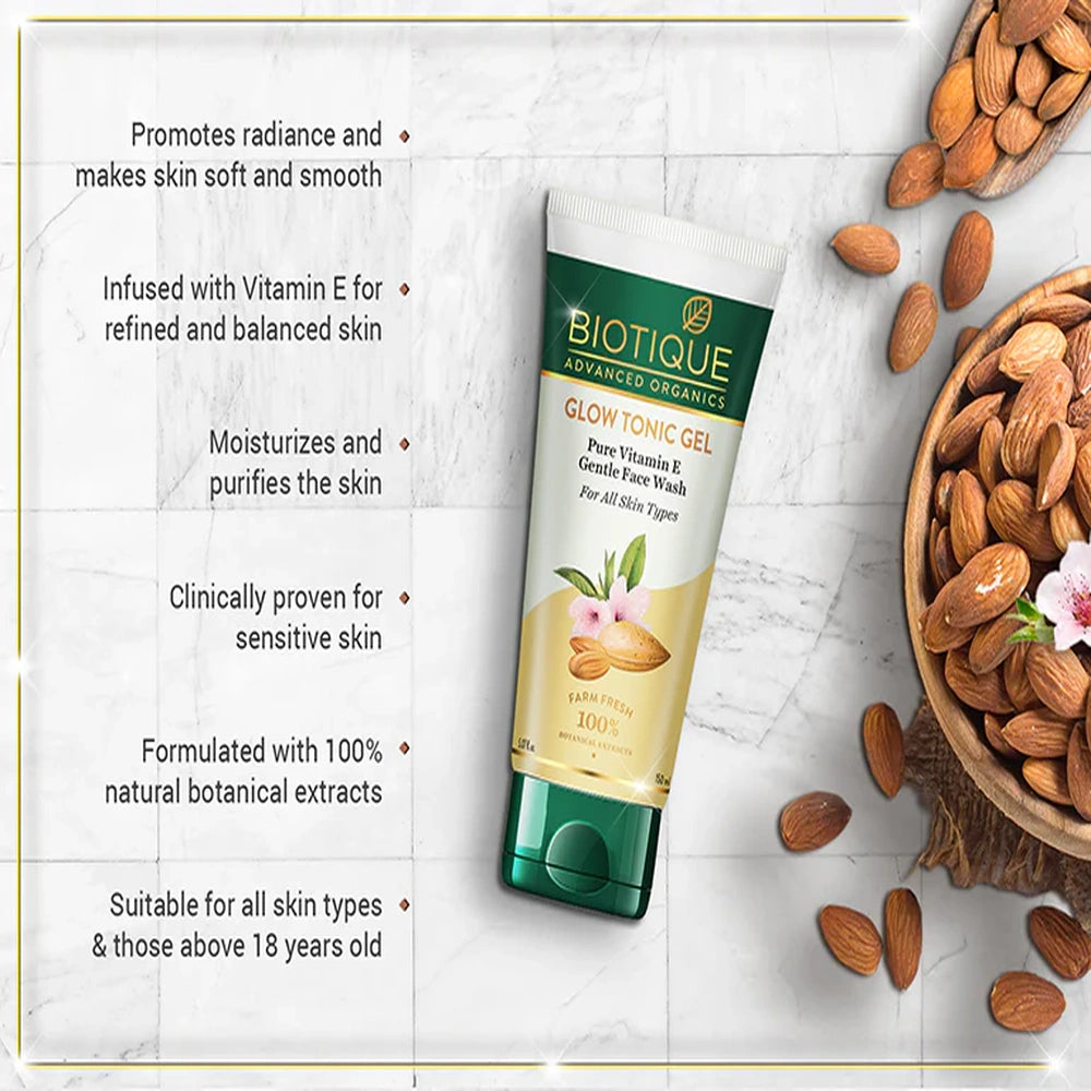 Biotique Glow Tonic Gel Pure Vitamin E Gentle Face Wash (150ml) offers a refreshing cleanse while nourishing the skin deeply. Enriched with pure Vitamin E, it helps protect against environmental stressors and supports skin repair, promoting a radiant and healthy complexion. Its gentle formula effectively removes impurities and excess oil without stripping moisture, making it suitable for daily use on all skin types. Experience balanced hydration and revitalized skin with every wash.