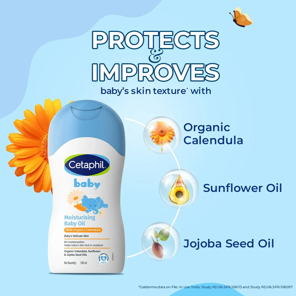Cetaphil Baby Moisturising Oil (200ml) blends organic calendula, sunflower oil, and jojoba seed oil to gently nourish and protect your newborn’s delicate skin. Dermatologist tested and pediatrician recommended, this lightweight formula supports skin hydration without clogging pores. Ideal for daily use, it helps maintain the natural moisture barrier while providing soothing care from the very first day.