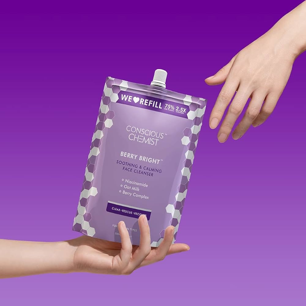 Conscious Chemist Berry Bright Soothing & Calming Face Cleanser Refill Pack (250ml) offers a gentle yet effective formula designed to soothe and calm sensitive skin. Enriched with natural berry extracts, it helps brighten the complexion while cleansing impurities without stripping essential moisture. This refill pack promotes sustainable use, making it an eco-friendly choice for daily skincare maintenance. Ideal for those seeking a balanced, refreshed, and radiant face with expert care.