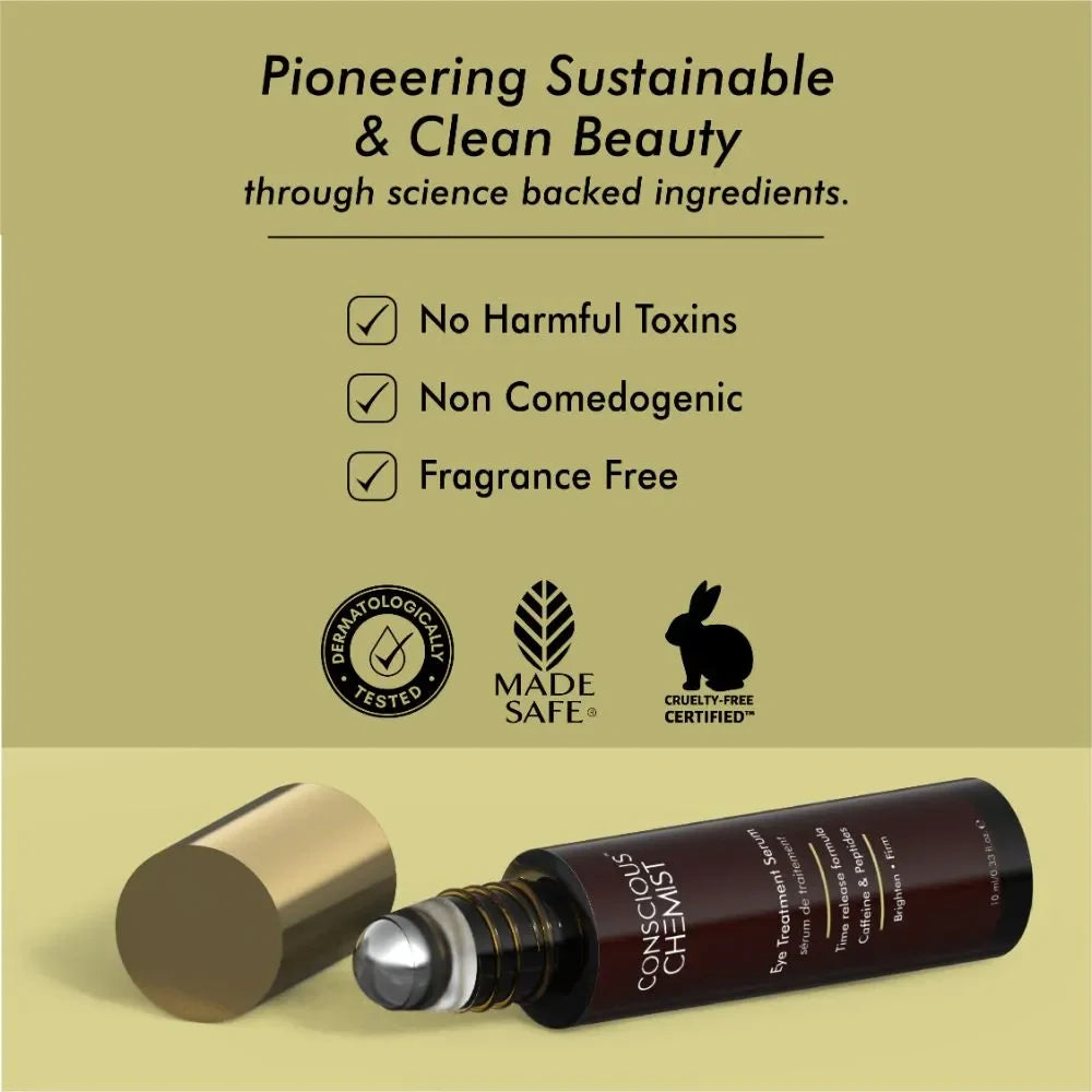 Conscious Chemist Eye Treatment Serum combines caffeine and peptides to target dark circles and crow's feet effectively. This 10 ml formula helps reduce puffiness and smooth fine lines around the delicate eye area, promoting a refreshed and youthful appearance. Ideal for daily use, it supports skin firmness and revitalization with consistent application.