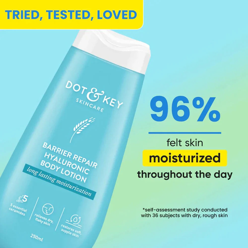 Dot & Key Barrier Repair Hyaluronic Acid Body Lotion (250ml) is designed to deeply hydrate and strengthen your skin's natural barrier. Formulated with hyaluronic acid, it replenishes moisture, improving skin elasticity and smoothness. This lightweight lotion supports skin repair, reducing dryness and sensitivity while promoting a healthier, more resilient complexion. Ideal for daily use, it absorbs quickly without leaving a greasy residue.
