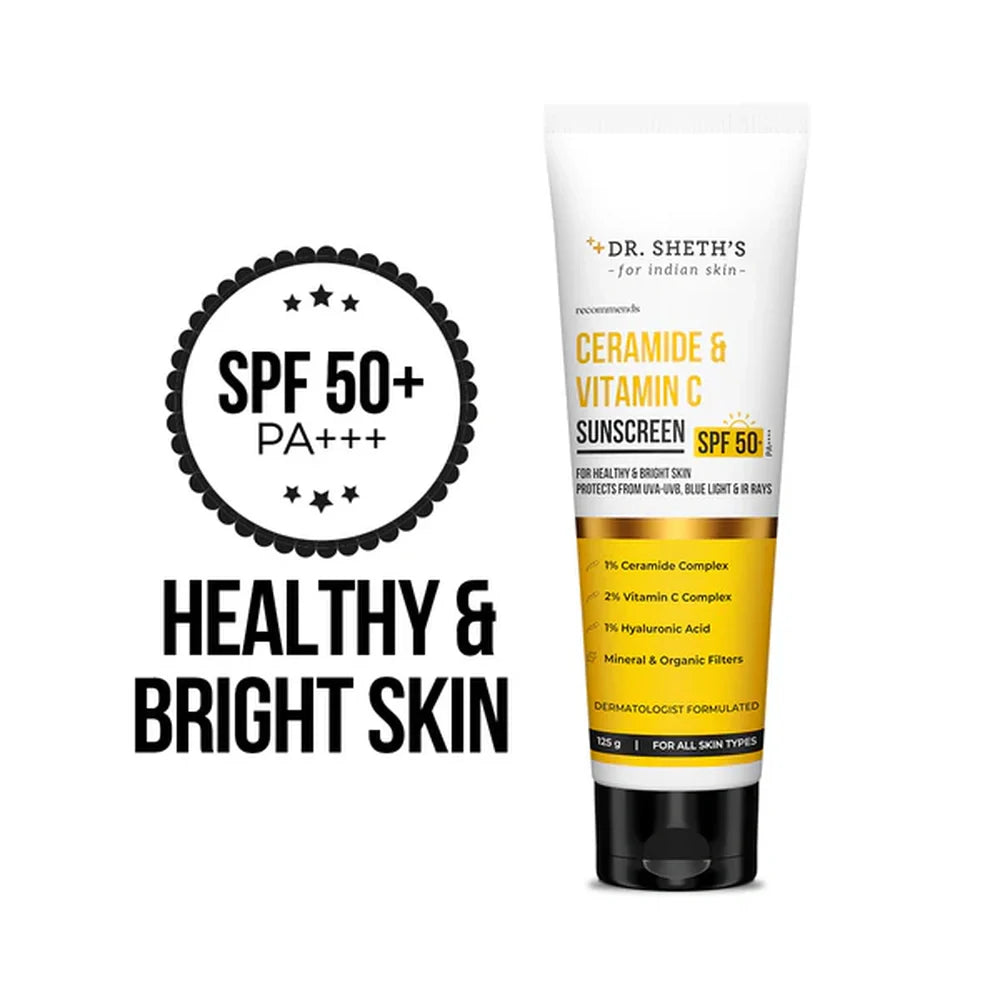 Dr. Sheths Ceramide & Vitamin C Sunscreen offers broad-spectrum protection while nourishing your skin. Formulated with ceramides to help strengthen the skin barrier and vitamin C to brighten and even out skin tone, this sunscreen shields against harmful UV rays without clogging pores. Its lightweight, non-greasy texture ensures comfortable daily wear, supporting skin health and radiance. Ideal for those seeking effective sun defense coupled with restorative skincare benefits.