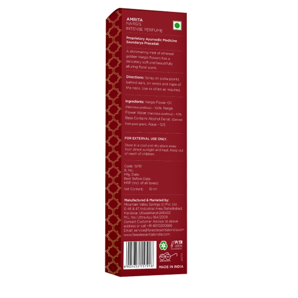 Forest Essentials Amrita Golden Nargis Intense Perfume captures the essence of the exquisite Nargis flower, offering a rich and sophisticated fragrance experience. This intense perfume blends floral notes with warm undertones, providing long-lasting scent that enhances your presence. Ideal for those who appreciate refined, natural aromas crafted with expert care, it embodies elegance and timeless beauty in a single bottle. Perfect for special occasions or daily wear, it leaves a subtle yet memorable impression.