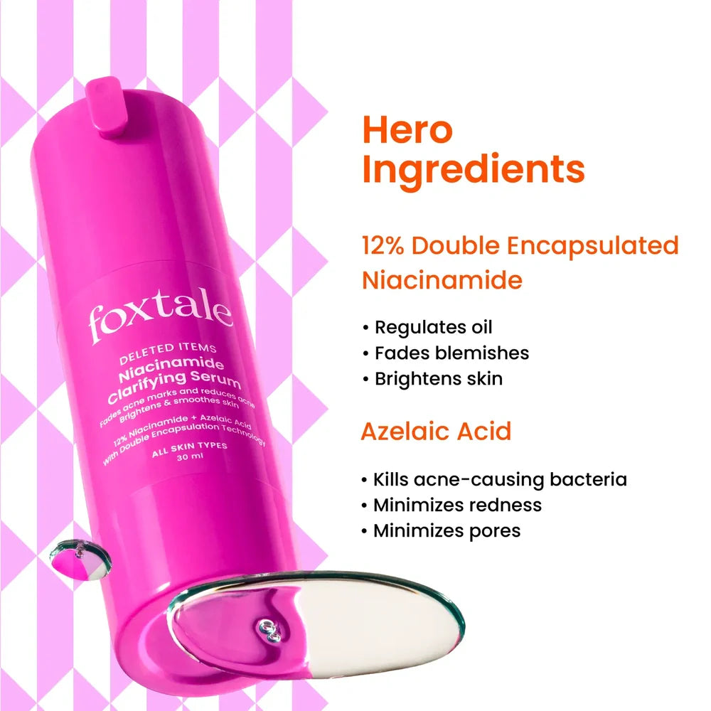 Foxtale 12% Niacinamide Serum combines a potent 12% concentration of niacinamide with azelaic acid to effectively regulate oil production and enhance skin brightness. This expertly formulated serum helps reduce the appearance of blemishes and uneven tone, promoting a clearer, more radiant complexion while supporting skin barrier health. Ideal for oily and combination skin types, it delivers targeted benefits for refined texture and balanced skin.