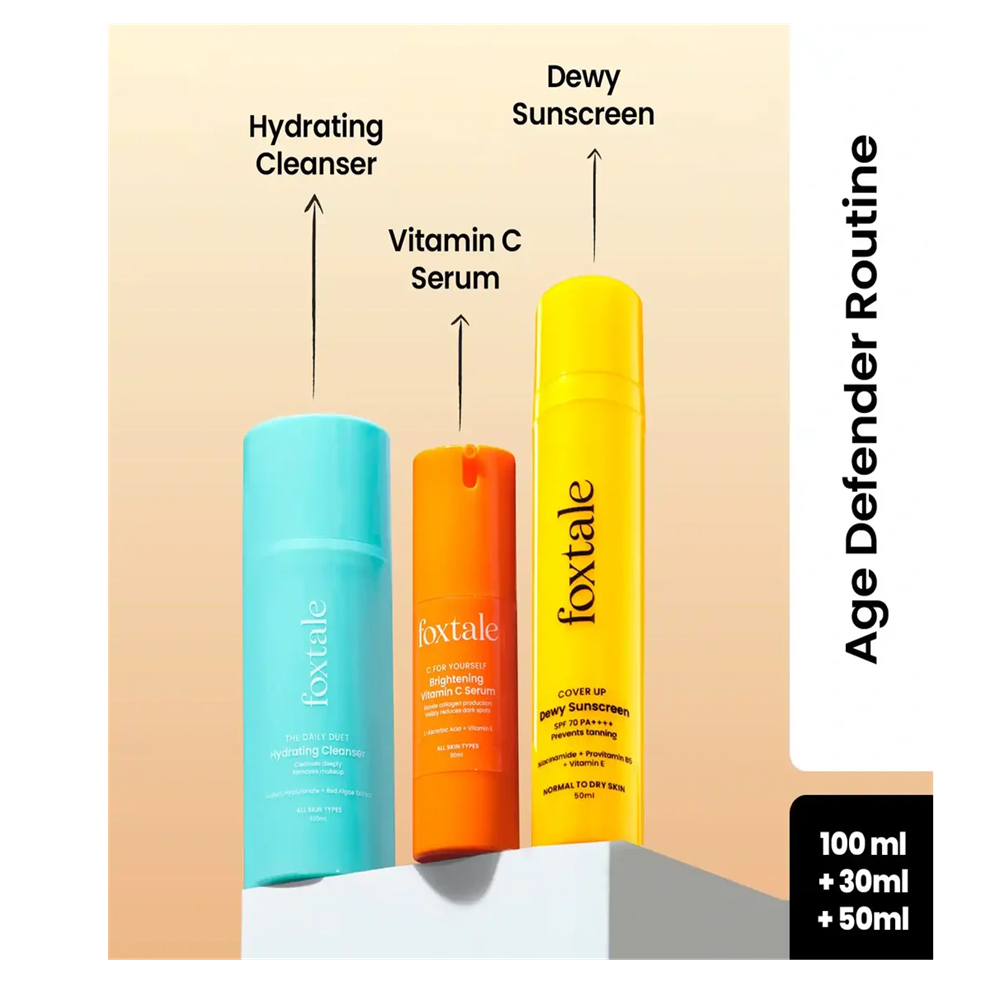The Foxtale Age Defender Routine Skin Care Kit combines a 100 ml cleanser, a 30 ml Vitamin C serum, and a 50 ml sunscreen with a dewy finish to support healthier, more youthful skin. The cleanser gently removes impurities, preparing your skin for the potent Vitamin C serum that brightens and defends against environmental damage. The lightweight sunscreen provides essential protection while enhancing your skin’s natural glow. This kit offers a comprehensive approach to daily skincare, helping to maintain firmness and even tone with consistent use.