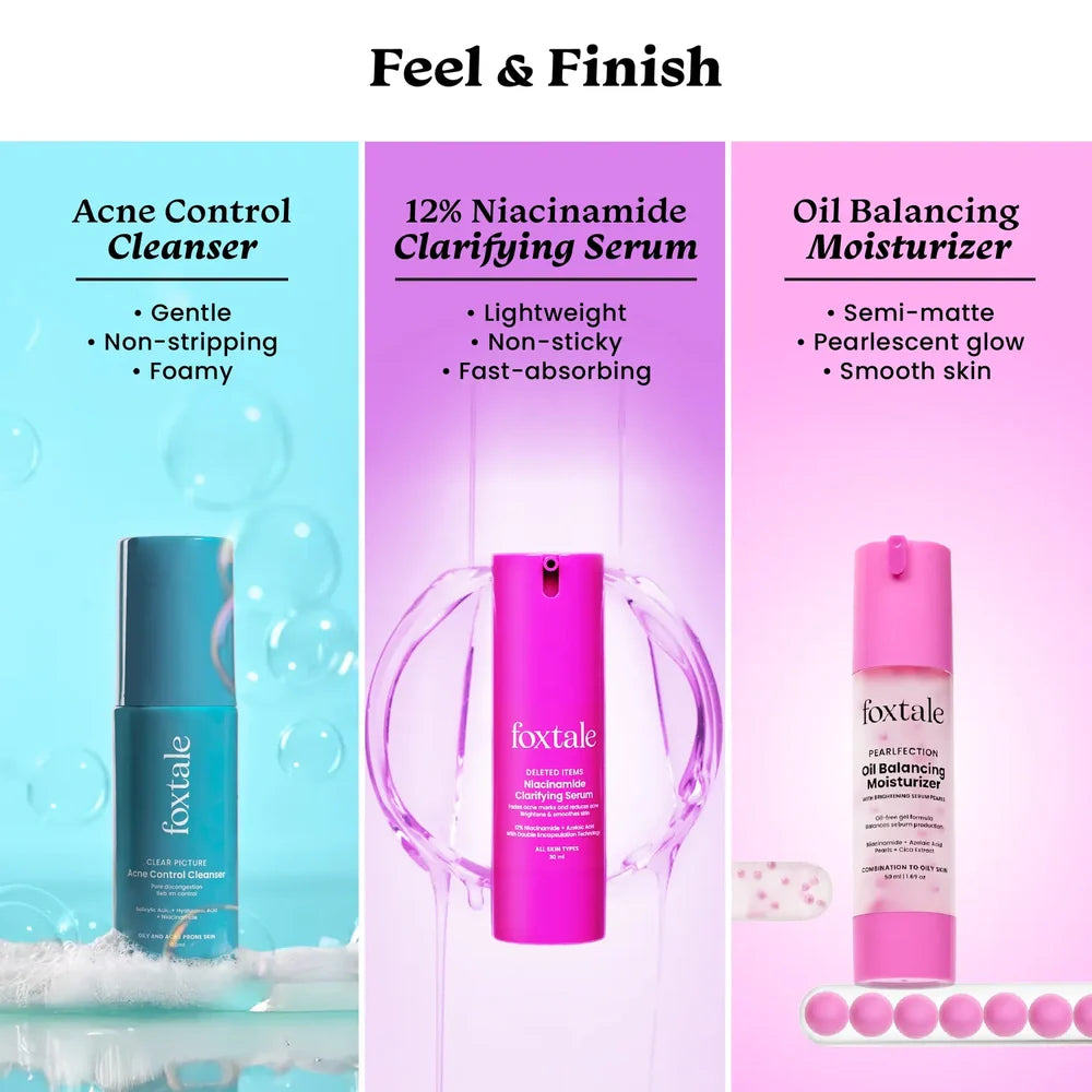 The Foxtale Clear Skin Care Trio combines a powerful acne cleanser, a 12% niacinamide serum, and an oil-balancing moisturizer to target acne, blemishes, and excess oil effectively. Formulated with salicylic acid, azelaic acid, and cica, this 180 ml set works synergistically to unclog pores, calm inflammation, and restore skin balance within 14 days. Ideal for oily and acne-prone skin, it promotes clearer, calmer, and healthier-looking skin through a dermatologist-inspired regimen.