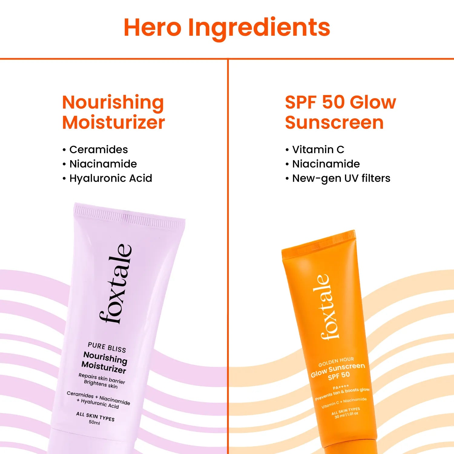 The FoxTale Hydra Glow Routine Combo combines a high-protection SPF 50 Glow Sunscreen (30 ml) with a deeply nourishing moisturizer (50 ml). Together, they shield your skin from harmful UV rays while providing intense hydration and a radiant finish. This dual-action set supports skin health by preventing sun damage and maintaining moisture balance, ideal for daily skincare with expert care.
