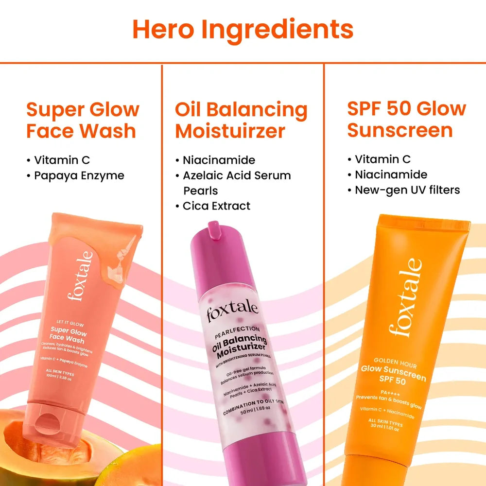The FoxTale Instant Glow Routine Kit combines a 100 ml Super Glow Face Wash, a 50 ml Oil Balancing Moisturizer, and a 30 ml SPF 50 Glow Sunscreen to deliver a comprehensive skincare regimen. This trio works synergistically to cleanse, hydrate, and protect your skin, promoting a radiant and balanced complexion while shielding against harmful UV rays. Ideal for maintaining healthy, glowing skin every day.