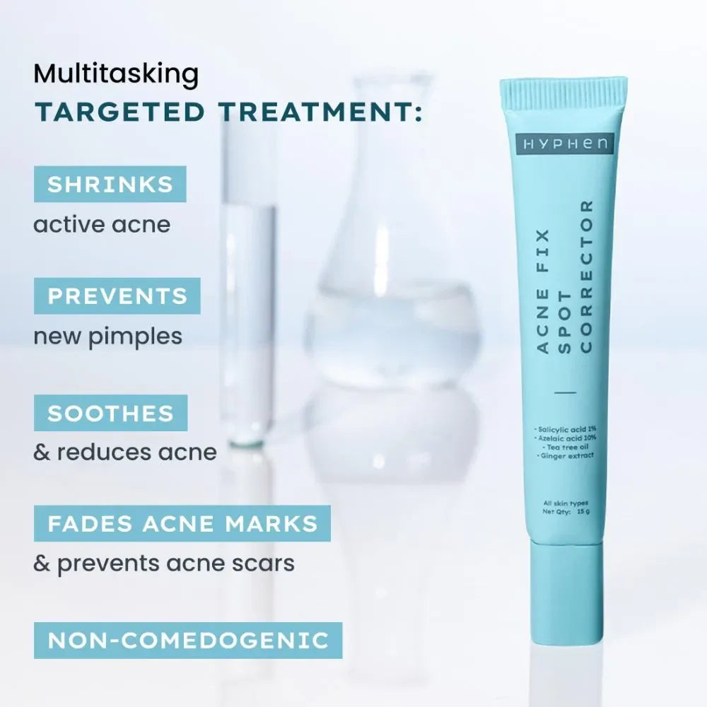 Hyphen Acne Fix Spot Corrector combines salicylic acid and azelaic acid to effectively target and reduce active acne. This 15gm formula works by shrinking pimples while preventing new breakouts, promoting clearer and healthier skin. Its expert blend helps reduce inflammation and unclog pores, making it a reliable solution for spot treating acne with precision.