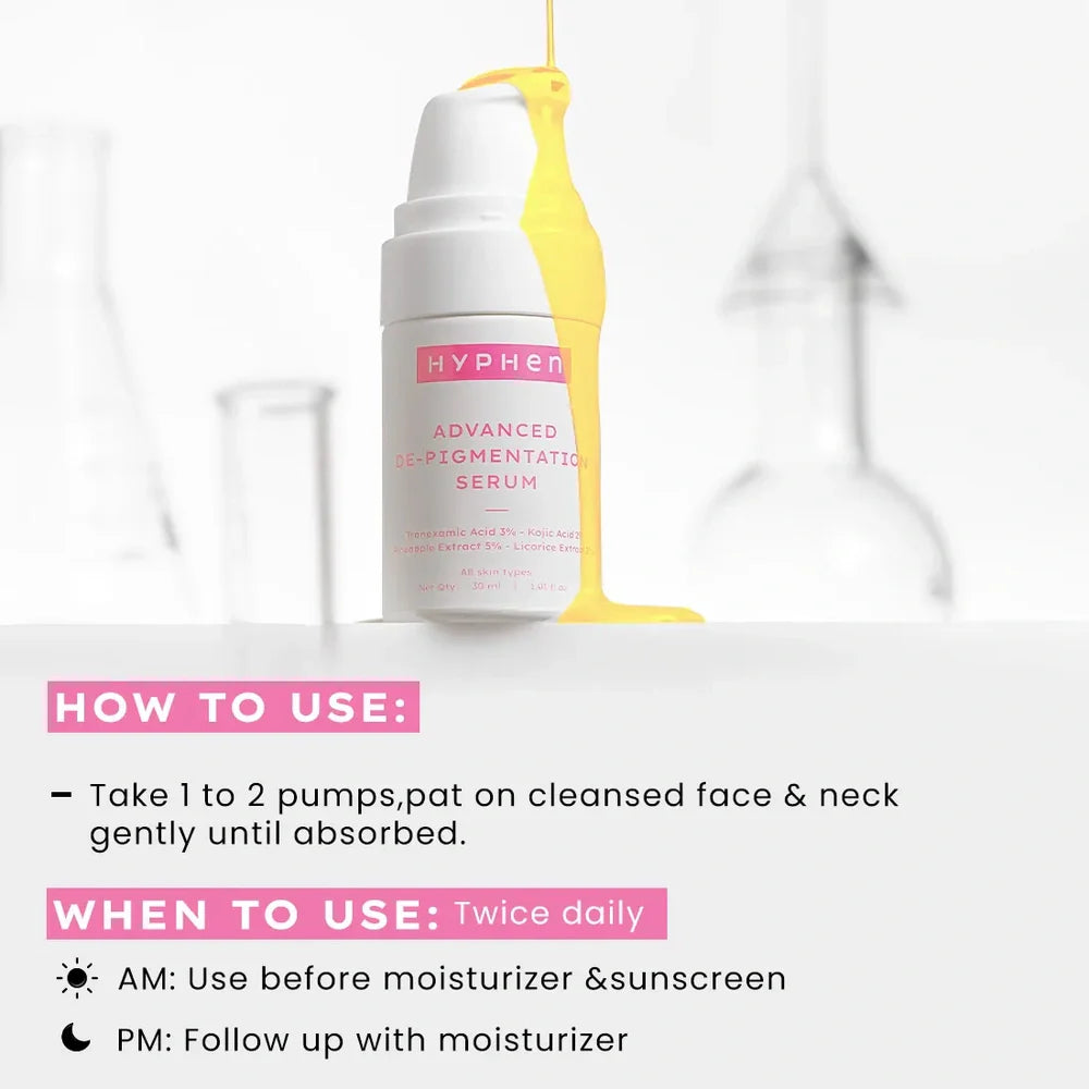 Hyphen Advanced De-Pigmentation Serum is a targeted treatment designed to reduce hyperpigmentation, melasma, dark spots, and scars. Formulated with 3% Tranexamic Acid and 2% Kojic Acid, it works to inhibit melanin production and promote a more even skin tone. This lightweight serum penetrates deeply to help fade discoloration and improve skin clarity, making it an effective solution for uneven pigmentation concerns. Regular use supports a brighter, more radiant complexion with a noticeable reduction in stubborn dark spots.