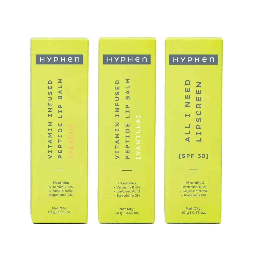 Experience the Hyphen Juicy Lips or Nothing Kit, a curated trio of lip balms designed to nourish, hydrate, and protect your lips throughout the day. This expert-selected combo ensures smooth, supple lips with a blend of moisturizing ingredients perfect for any skin type. Ideal for daily use, each balm in this set provides balanced hydration without heaviness, making it a versatile essential for maintaining lip health and softness.