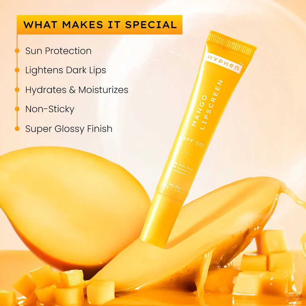 Hyphen Mango Lip Screen SPF 50 PA++++ combines advanced sun protection with skin-brightening benefits. Enriched with 2% Kojic Acid, it helps reduce dark pigmentation, while 1% Vitamin E and Vitamin C nourish and moisturize dry lips. The SPF 50 PA++++ shield safeguards your lips from harmful UV rays, preventing sun damage and premature aging. This lightweight balm offers both care and protection, making it an essential daily lip treatment.