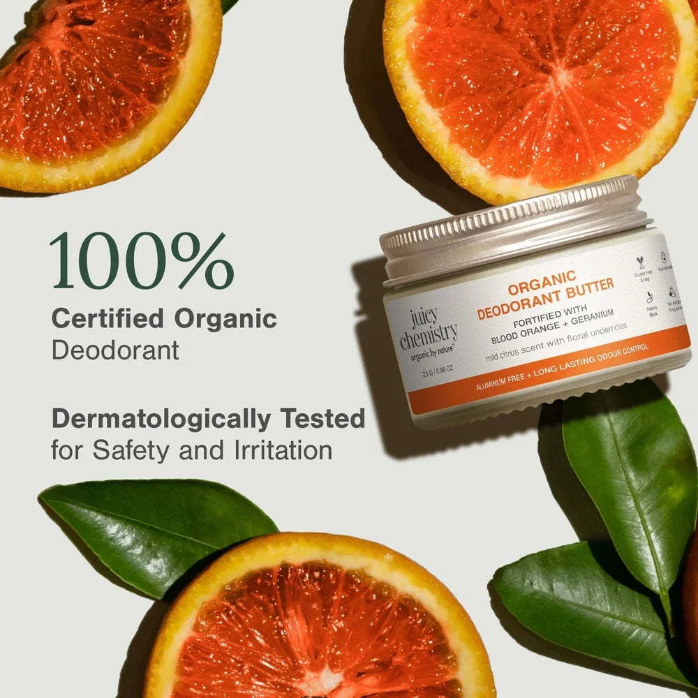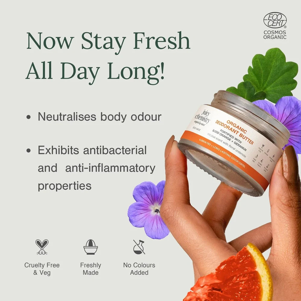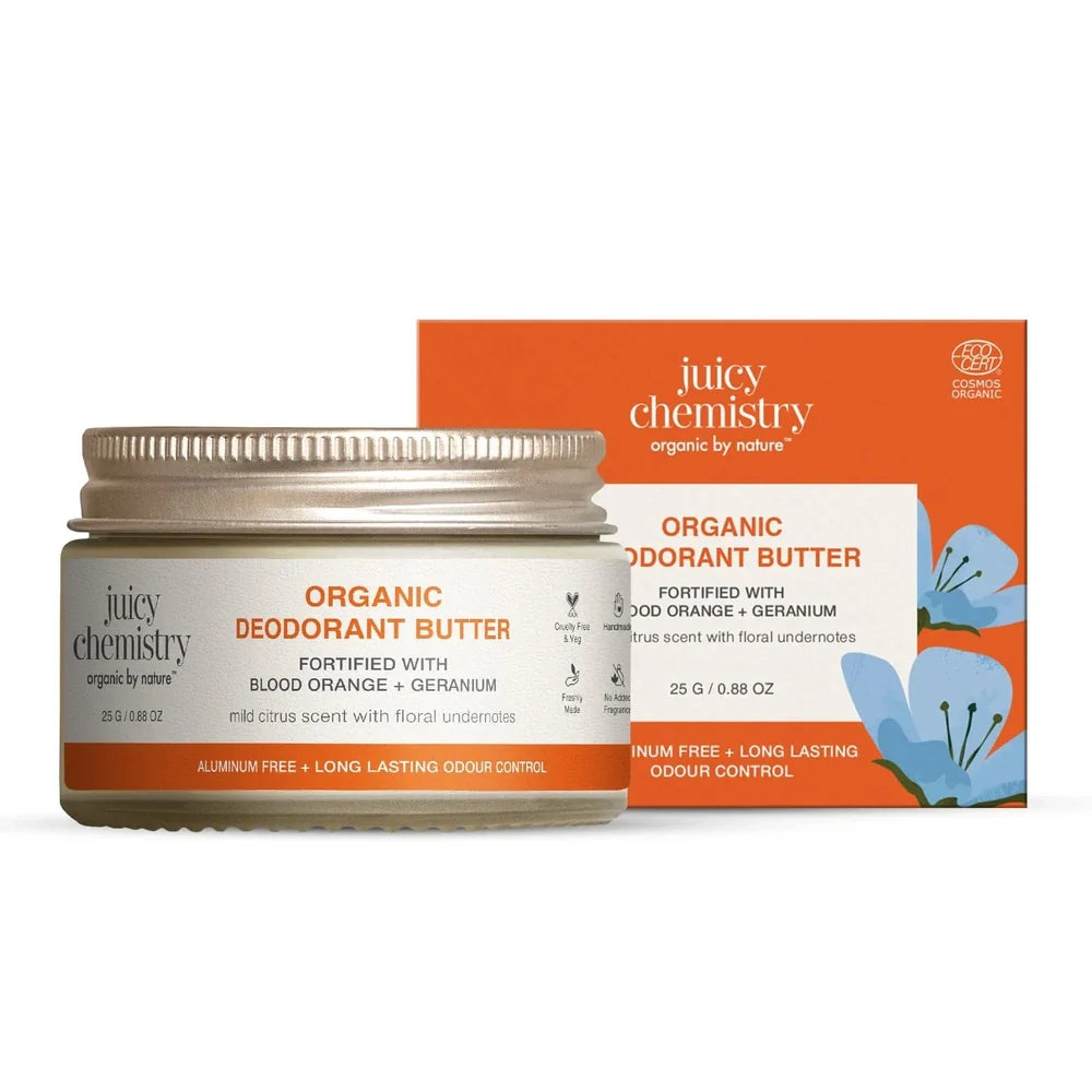 Juicy Chemistry Blood Orange and Geranium Deodorant offers a natural and effective way to stay fresh throughout the day. Formulated with organic blood orange and geranium essential oils, this deodorant provides a refreshing citrus scent while helping to neutralize odor-causing bacteria. Free from aluminum and synthetic chemicals, it gently cares for sensitive skin, promoting a healthy balance without blocking pores. Ideal for daily use, it combines expert craftsmanship with natural ingredients for reliable, skin-friendly odor protection.