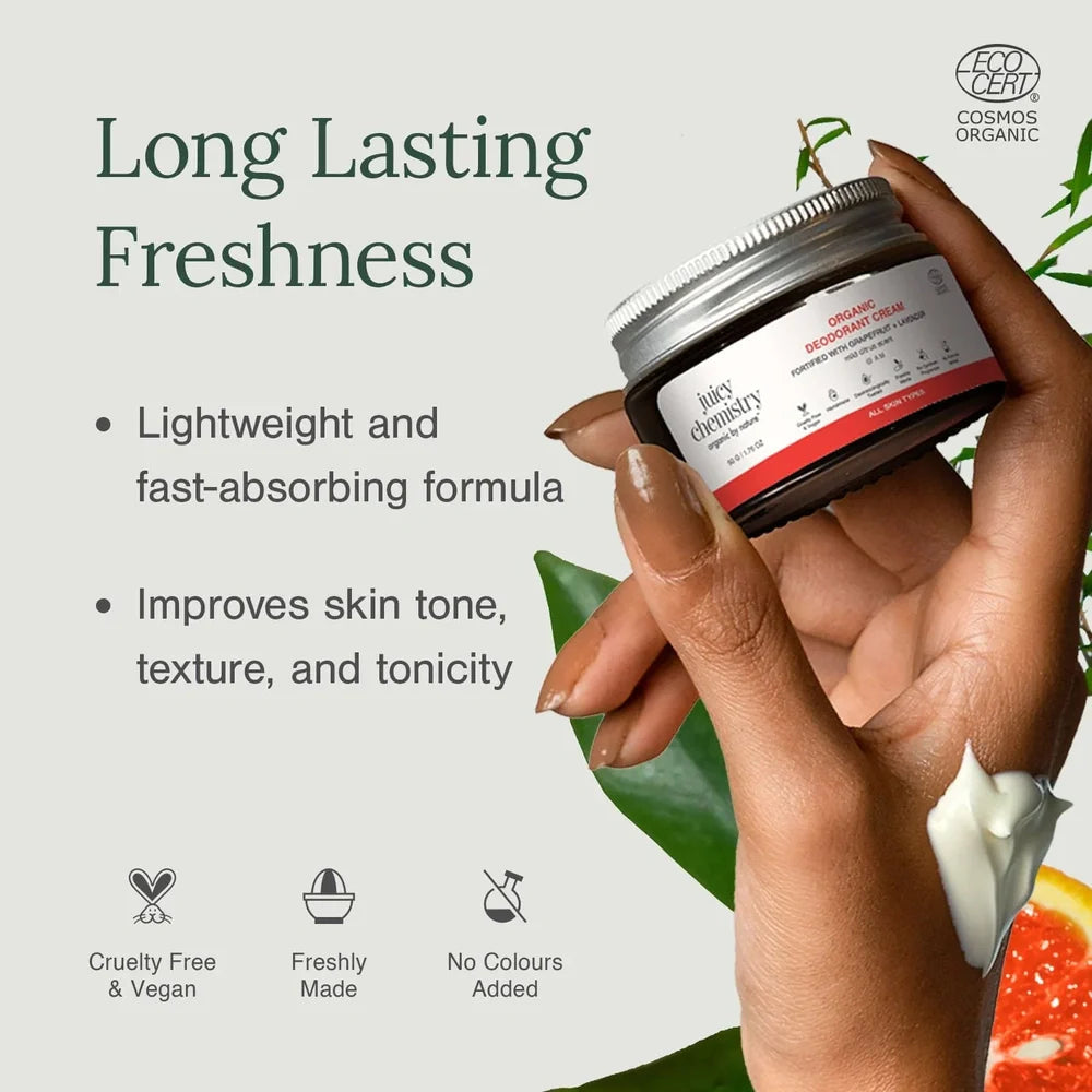 Juicy Chemistry Grapefruit and Lavender Organic Deodorant Cream (50g) offers a natural, effective solution to odor control. Formulated with organic grapefruit and lavender essential oils, it provides gentle antibacterial protection while leaving a refreshing, subtle scent. This cream deodorant is free from harmful chemicals, making it suitable for sensitive skin and daily use. Its nourishing ingredients help maintain skin balance and prevent irritation, ensuring all-day freshness without clogging pores. Ideal for those seeking a safe, eco-friendly alternative to conventional deodorants.