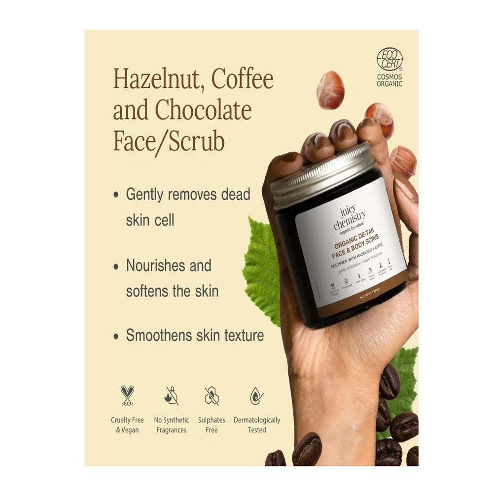 Juicy Chemistry Hazelnut, Coffee and Chocolate Mask (75g) combines the natural benefits of hazelnut, coffee, and chocolate to deeply nourish and rejuvenate your skin. This mask helps detoxify and purify pores while delivering antioxidants that promote a radiant and even complexion. Its rich formula supports improved skin texture and hydration, making it ideal for a revitalizing skincare ritual that leaves skin refreshed and glowing.