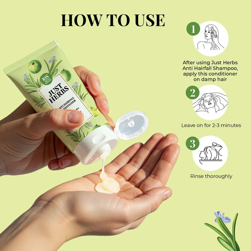 Experience the benefits of Just Herbs Anti Hairfall Conditioner, enriched with rosemary, amla, and a blend of 14 potent herbs. This expert formulation strengthens hair roots, reduces breakage, and supports healthier, thicker hair growth. Its natural ingredients help nourish the scalp, improve hair texture, and minimize hair fall, making it an ideal choice for maintaining resilient and vibrant hair. Suitable for regular use, it leaves hair soft, manageable, and revitalized without harsh chemicals.