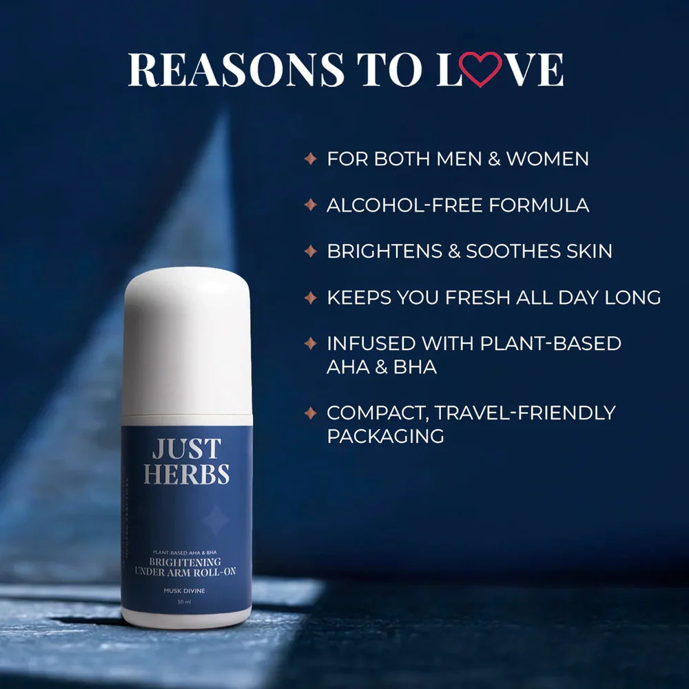 Just Herbs Musk Divine Brightening Underarm Roll-On Deo (50ml) is expertly formulated to brighten and refresh delicate underarm skin while providing lasting odor protection. This gentle roll-on combines natural ingredients that help reduce pigmentation and soothe irritation, promoting a more even tone. Its non-sticky, fast-absorbing texture ensures comfort throughout the day, making it an ideal choice for maintaining underarm hygiene with care and confidence.