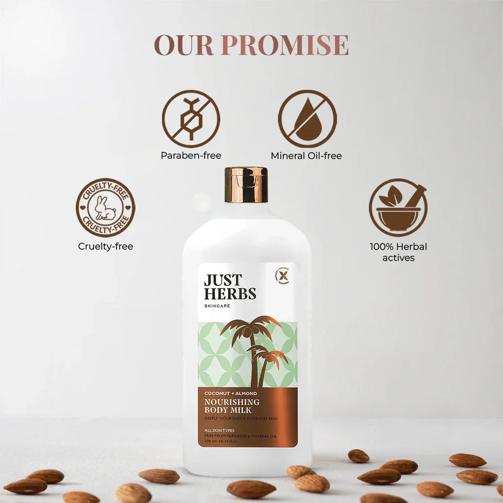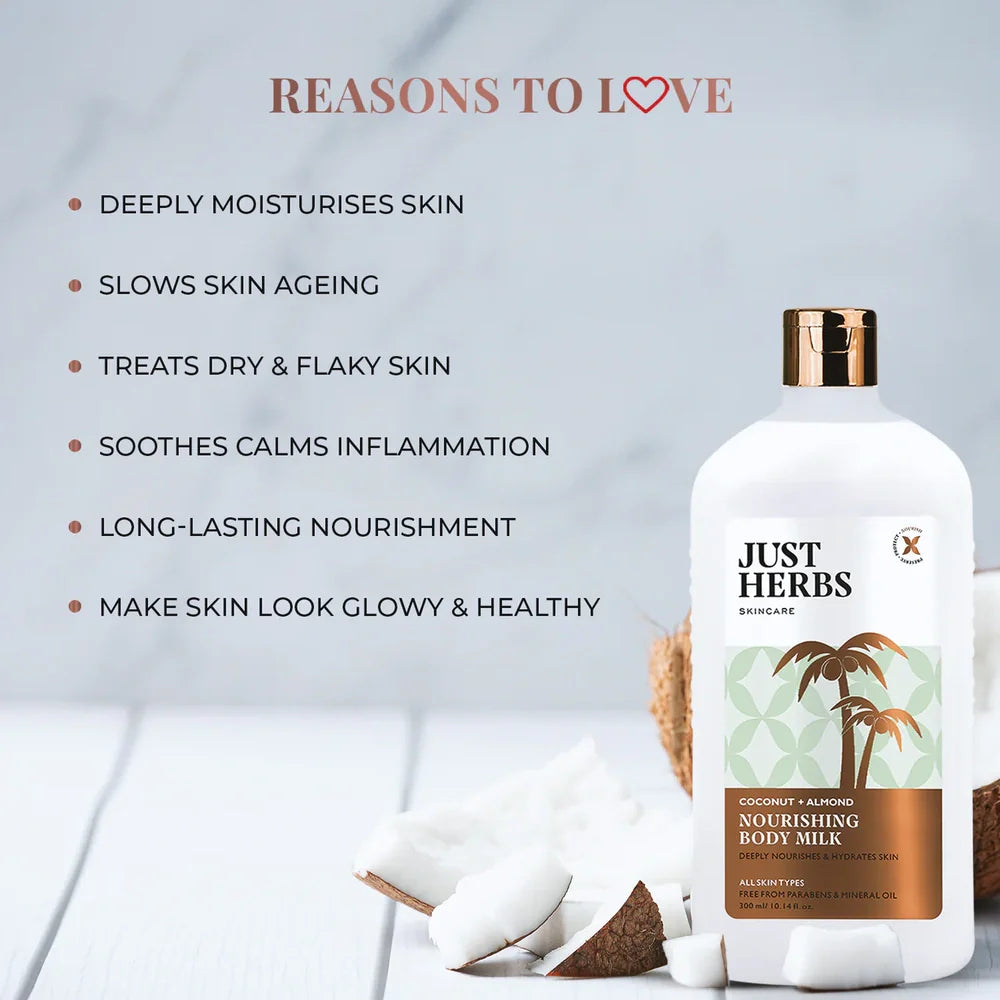 Just Herbs Nourishing Body Milk with Coconut and Almond (300ml) delivers deep hydration through a blend of natural coconut and almond oils. This lightweight formula absorbs quickly, leaving skin soft, smooth, and replenished without any greasy residue. Ideal for daily use, it supports skin’s natural barrier and helps maintain long-lasting moisture. Expertly crafted for nourishment and gentle care, it suits all skin types seeking balanced hydration and a subtle, natural fragrance.