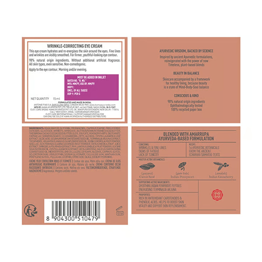 Kama Ayurveda Amarrupa Wrinkle-Correcting Eye Cream is a meticulously crafted formula designed to reduce fine lines and wrinkles around the delicate eye area. Enriched with potent natural ingredients, it promotes skin elasticity and hydration, helping to restore a youthful, radiant appearance. This lightweight cream absorbs quickly, offering targeted nourishment while soothing and firming the skin, making it an essential addition to your advanced skincare regimen.