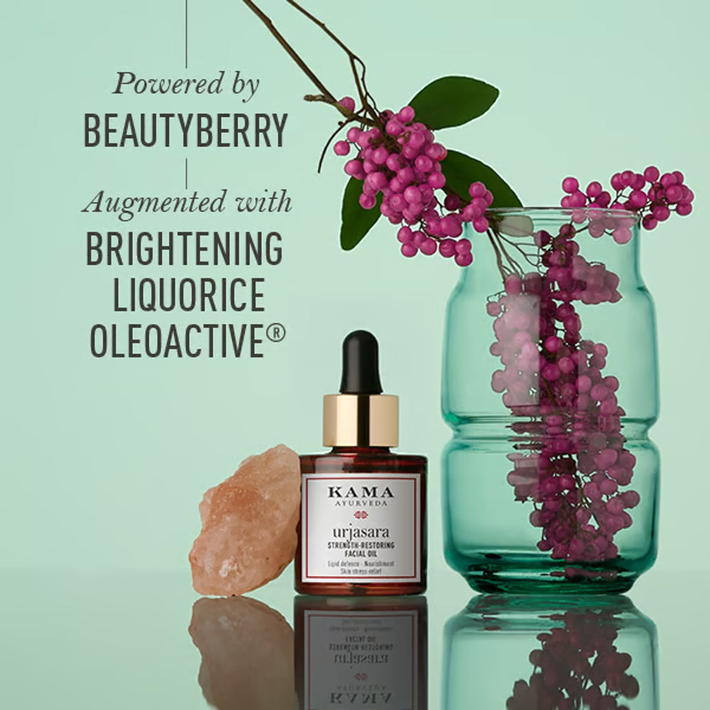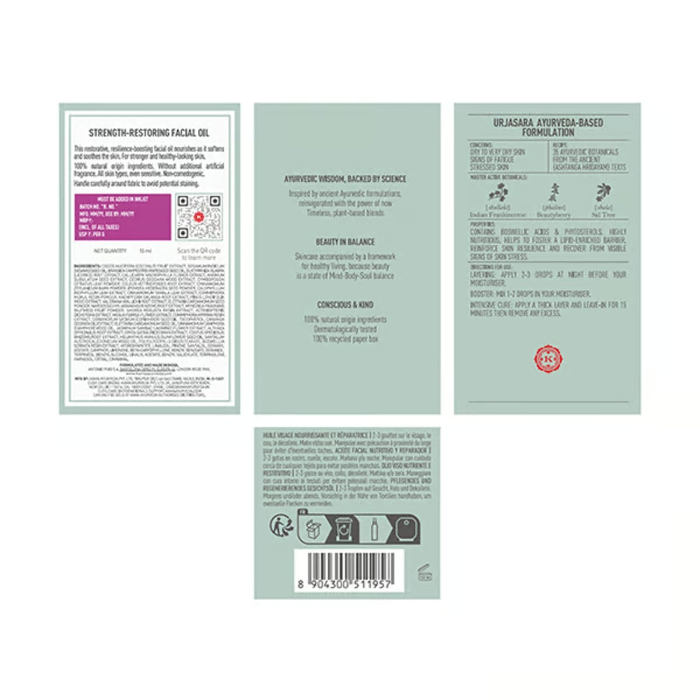 Kama Ayurveda Urjasara Strength-Restoring Facial Oil is a potent blend crafted to revitalize and strengthen your skin's natural barrier. This lightweight 15ml oil combines time-tested Ayurvedic ingredients to nourish deeply, enhance skin resilience, and promote a balanced, radiant complexion. Ideal for restoring vitality to tired, dull skin, it supports long-term skin health with consistent use.