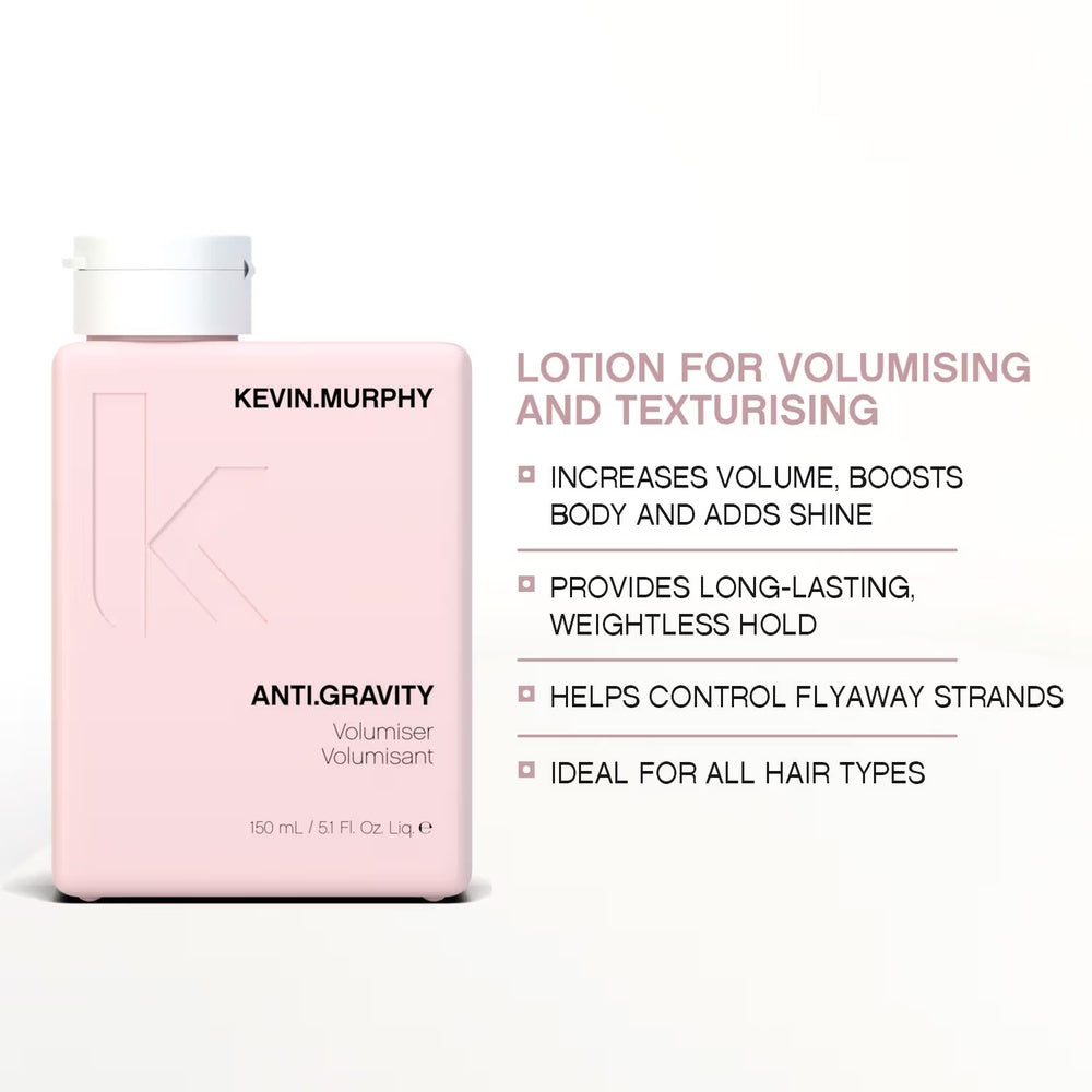 Kevin Murphy Anti Gravity (150ml) is a lightweight volumizing spray designed to lift hair from the roots, creating natural, long-lasting volume and body without stiffness. Its unique formula supports hair structure, providing a smooth finish and enhanced manageability, making it ideal for fine or flat hair in need of added fullness and control.