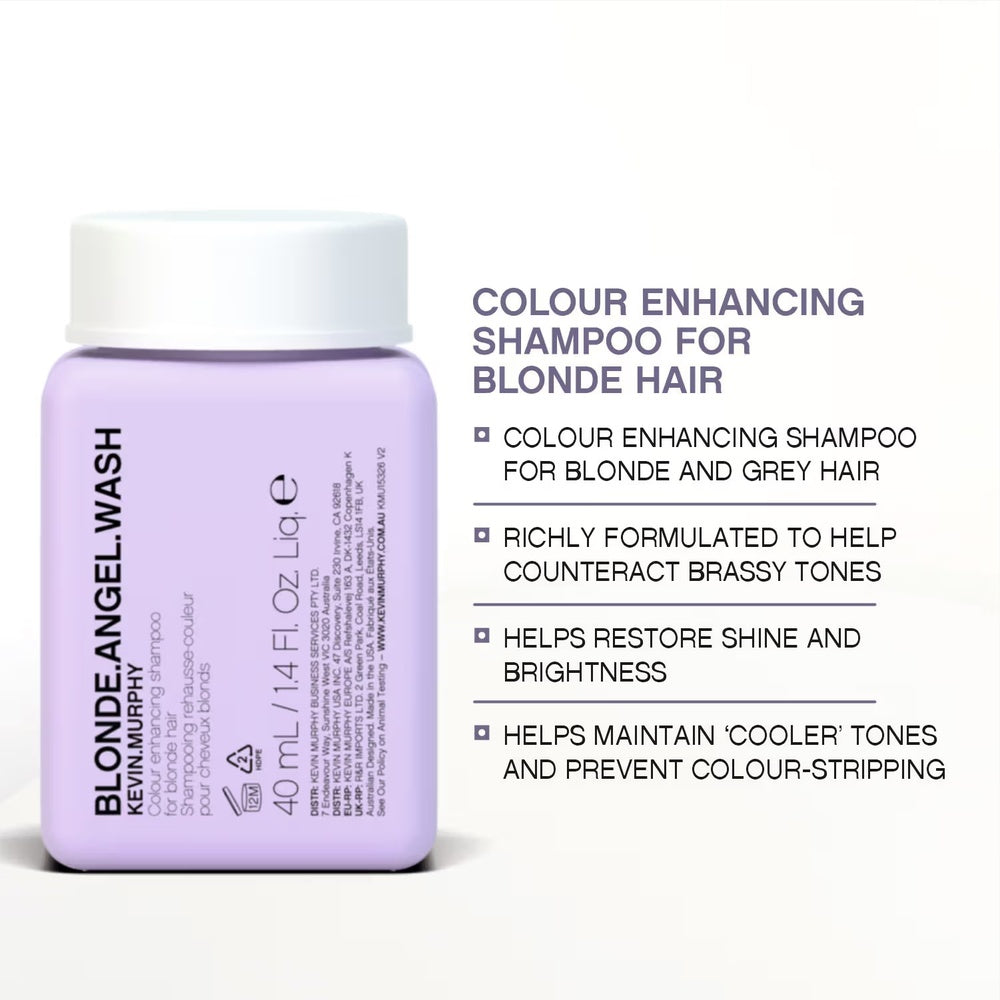 Kevin Murphy Blonde Angel Wash Hair Shampoo (40ml) gently cleanses blonde and lightened hair while enhancing brightness and vitality. This carefully formulated shampoo helps maintain tone, preventing brassiness and preserving the hair’s natural shine. Ideal for on-the-go use, its concentrated size delivers salon-quality care without weighing hair down, leaving strands feeling refreshed, soft, and vibrant.