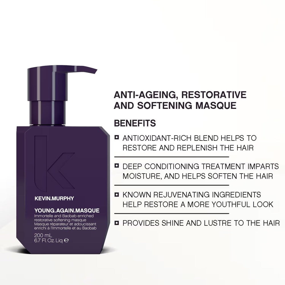 Kevin Murphy Young Again Masque (200ml) is a deeply nourishing treatment designed to restore vitality and softness to mature or damaged hair. Formulated with antioxidant-rich ingredients, it helps to protect hair from environmental stressors while improving elasticity and shine. This masque rejuvenates strands, leaving hair feeling silky, manageable, and visibly healthier. Ideal for maintaining youthful, vibrant hair with regular use.
