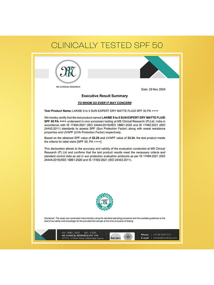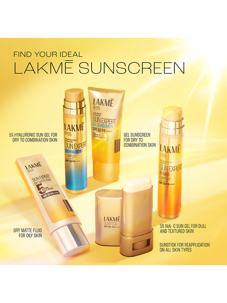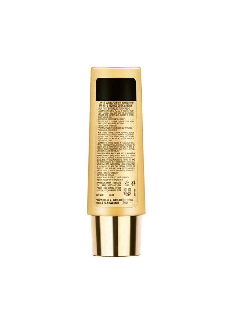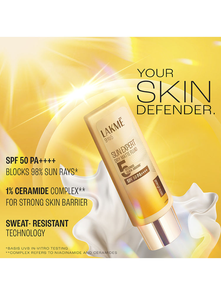 Shield your skin from harsh UV rays with Lakme Sun Expert Dry Matte Fluid SPF 50 PA++++ — a lightweight, fast-absorbing sunscreen powered with 1% Niacinamide and Ceramides. This daily-use fluid sunscreen offers broad-spectrum protection while improving skin texture and hydration, leaving your skin soft, smooth, and shine-free.
