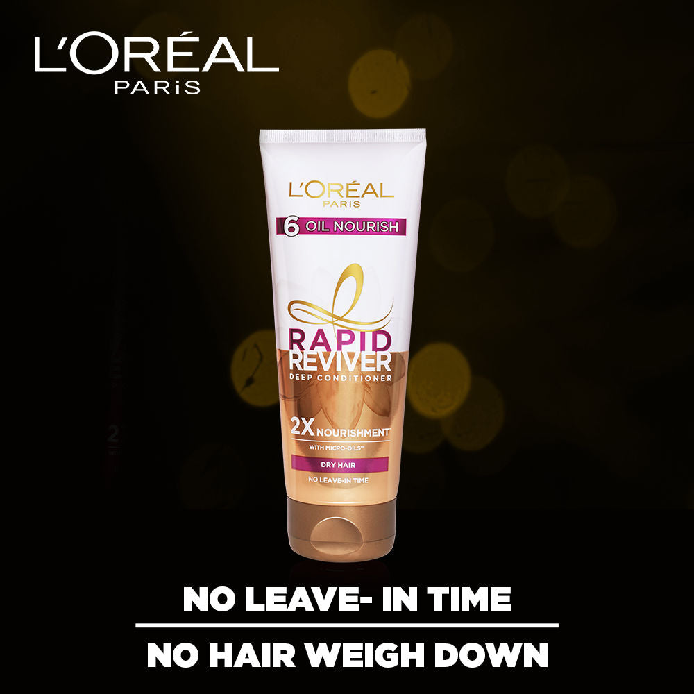 L'Oreal Paris 6 Oil Nourish Rapid Reviver is a deeply conditioning treatment for dry hair. Infused with a blend of 6 essential oils, it provides 2X more nourishment in no time, leaving hair soft, shiny, and manageable without weighing it down.