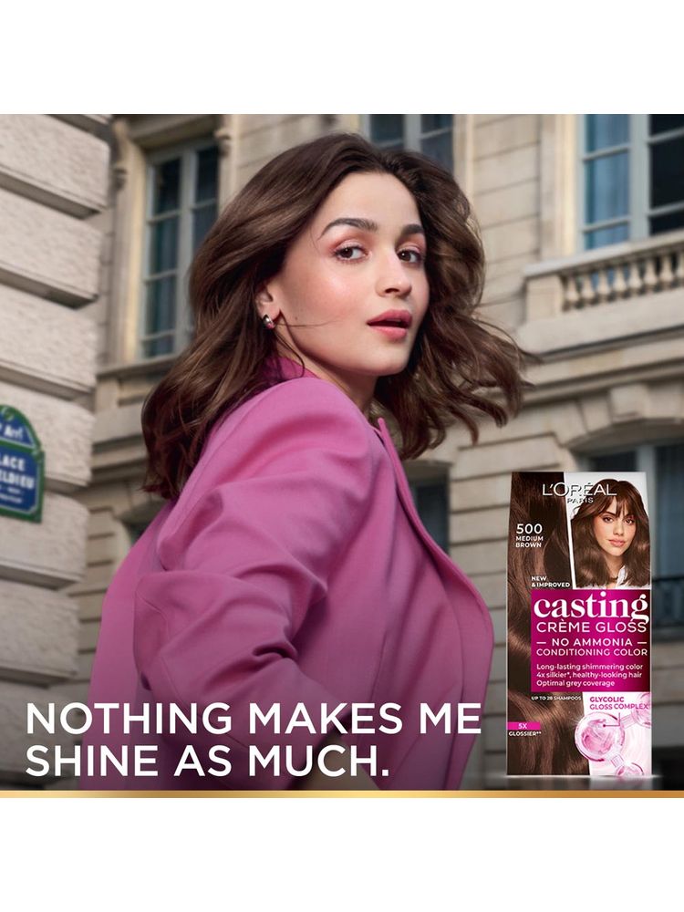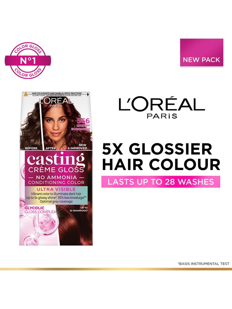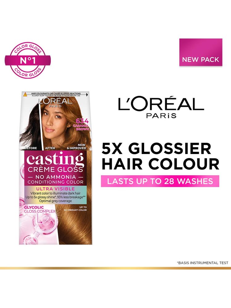 Transform your hair with a vibrant, natural-looking shine using L'Oreal Paris Casting Creme Gloss. This ammonia-free conditioning hair color gently enhances your natural tone while providing rich color and glossy finish. Infused with royal jelly, the nourishing formula leaves hair satin-soft and visibly healthy. With a palette of flattering shades, it covers greys beautifully and lasts up to 28 shampoos. Ideal for first-time colorers and those seeking low-maintenance hair color with maximum shine, this hair color also comes with a post-color conditioner for added softness and vibrancy. Say hello to healthier, glossier hair with every use.