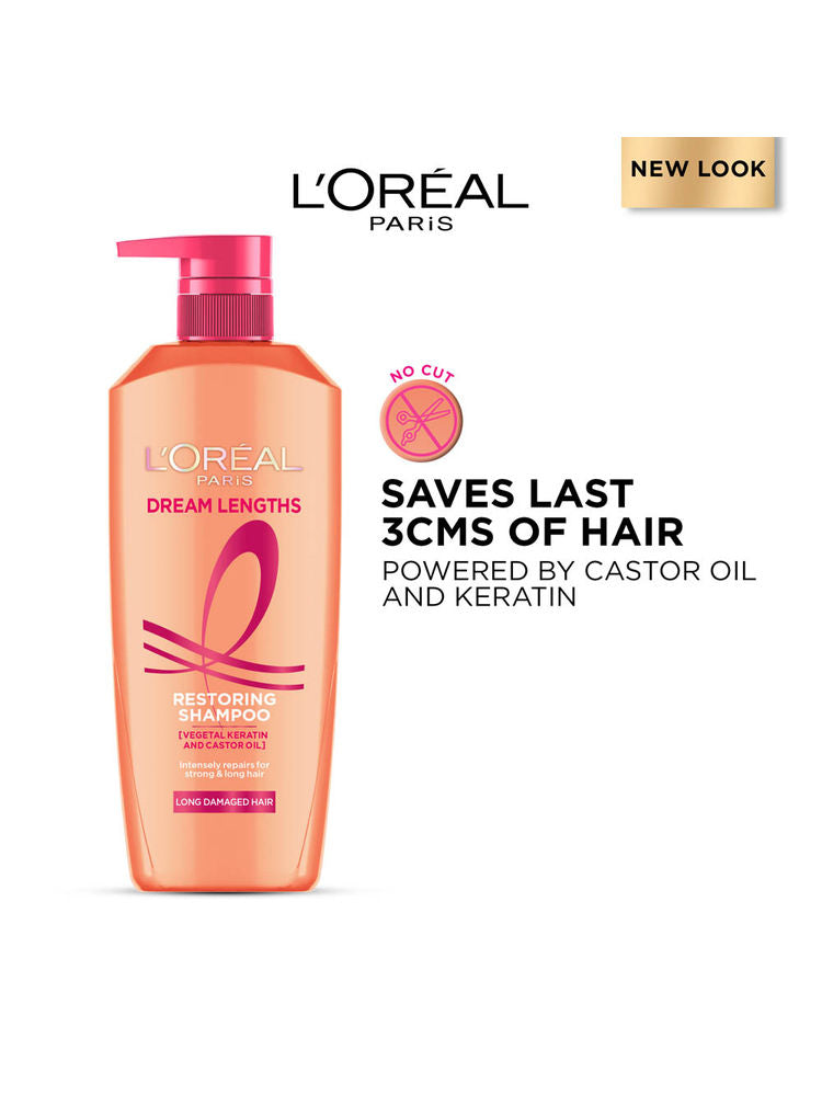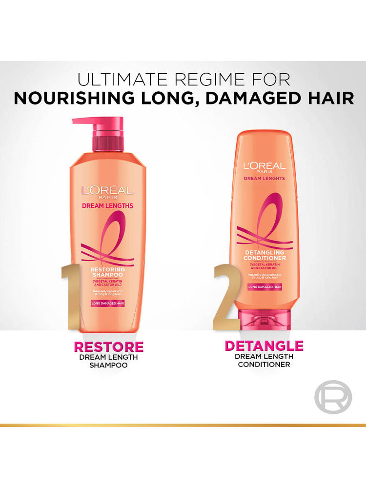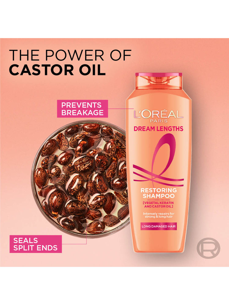 L'Oreal Paris Dream Lengths Restoring Shampoo is specially designed for long, damaged hair. Enriched with Keratin and Castor Oil, it strengthens hair to reduce breakage and split ends while keeping hair smooth, shiny, and nourished.