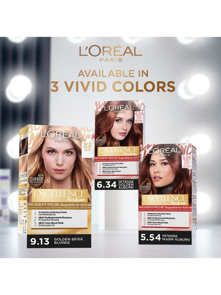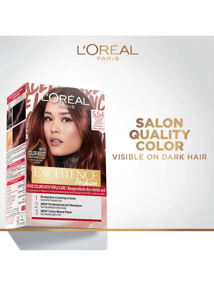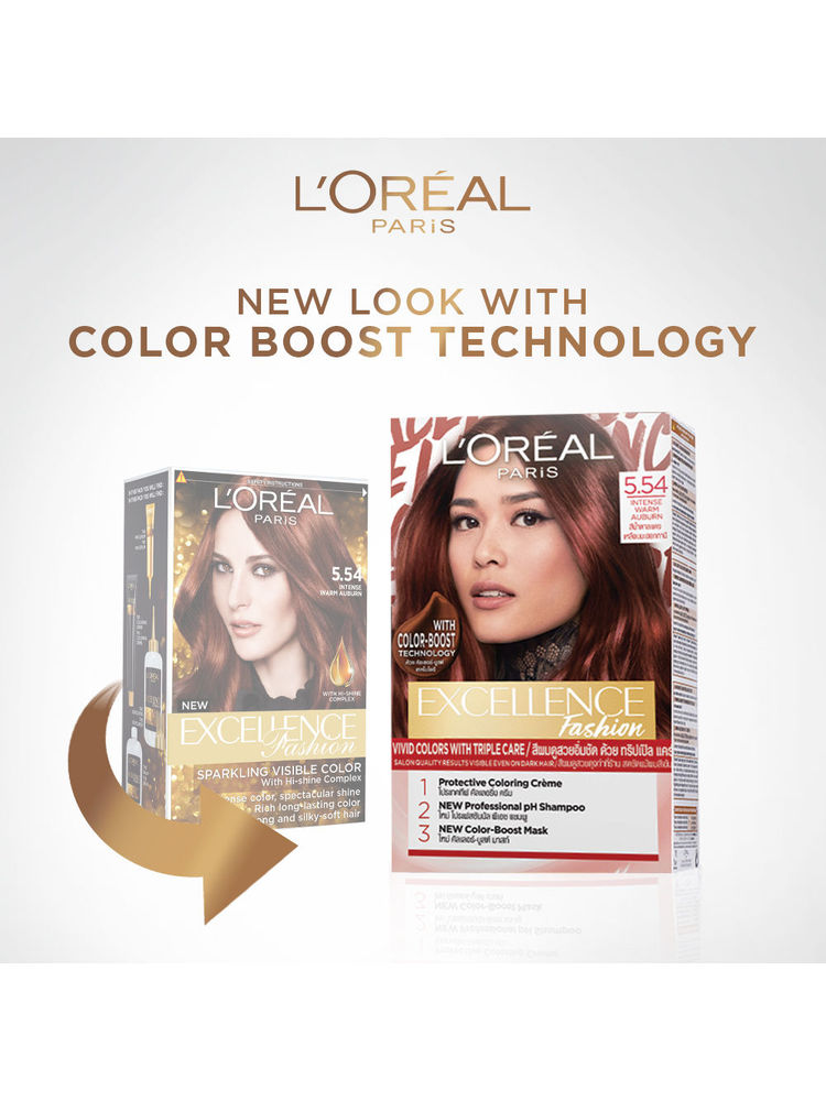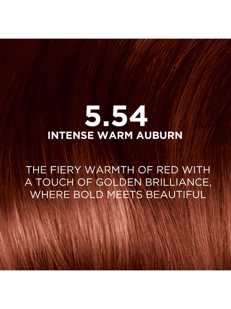 L'Oreal Paris Excellence Fashion Hair Color in 5.54 Intense Warm Auburn offers vibrant, long-lasting color with salon-like shine. The formula is enriched with Hi-Shine Complex and includes a post-color conditioner for radiant, nourished hair.