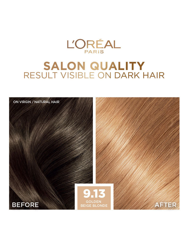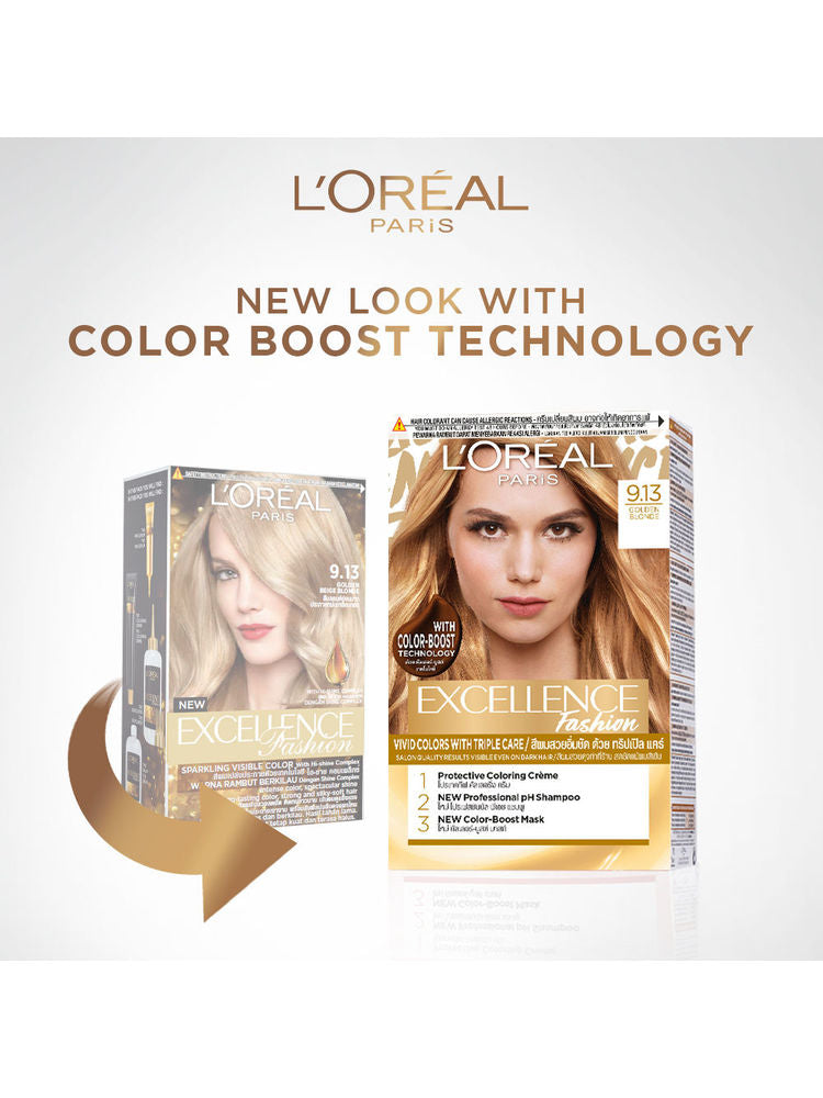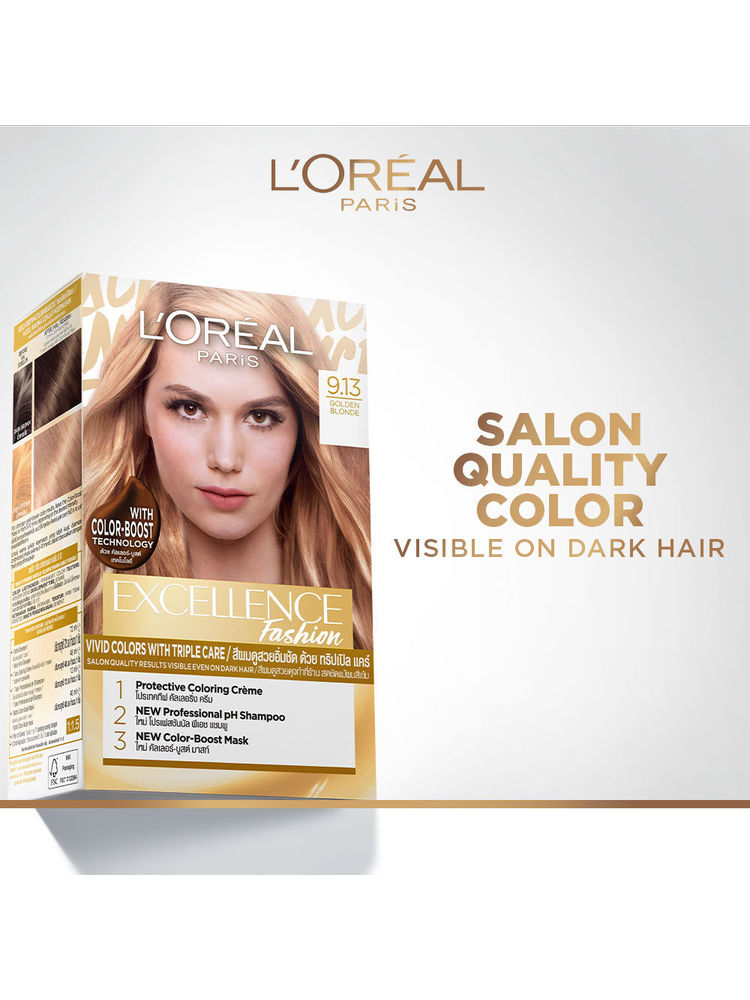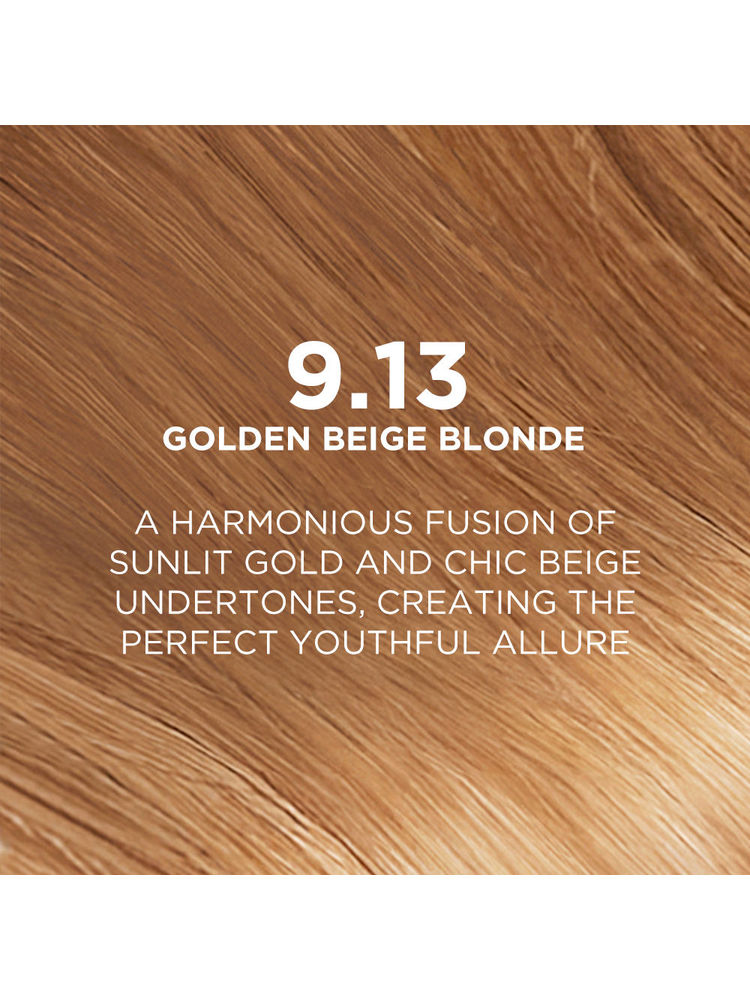 L'Oreal Paris Excellence Fashion Hair Color in 9.13 Golden Beige Blonde provides salon-quality results at home. This formula delivers rich blonde tones with radiant shine and 100% grey coverage.