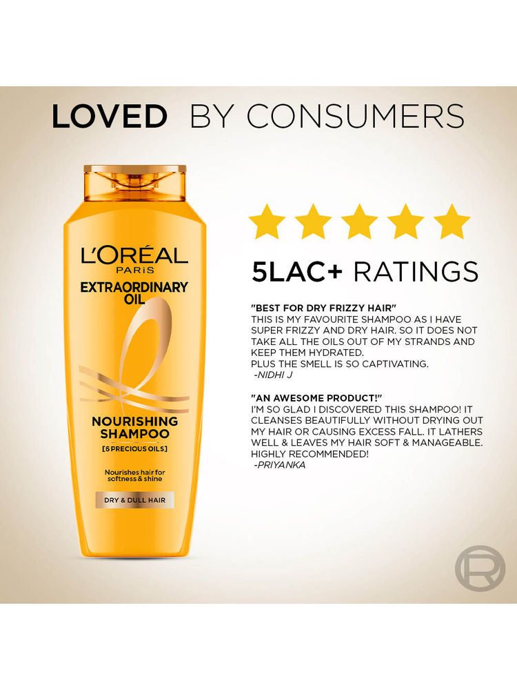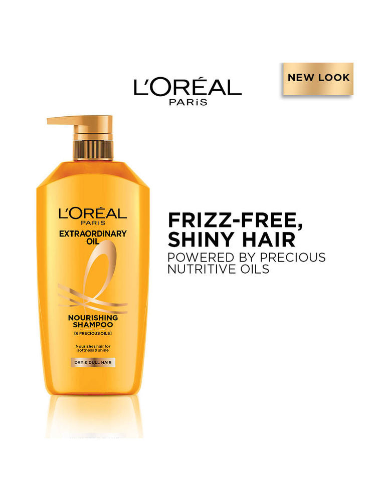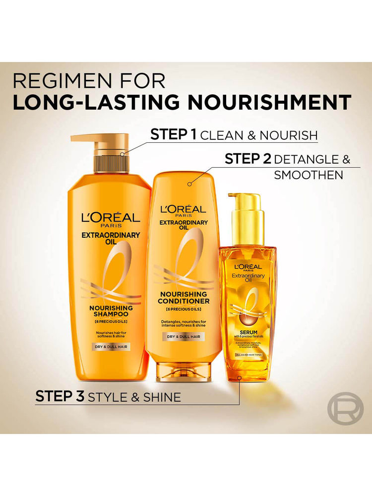 L'Oreal Paris Extraordinary Oil Nourishing Shampoo is infused with six floral oils that deeply nourish and transform dry, lifeless hair into soft, lustrous strands. It smoothens hair while controlling frizz, delivering salon-like results at home.