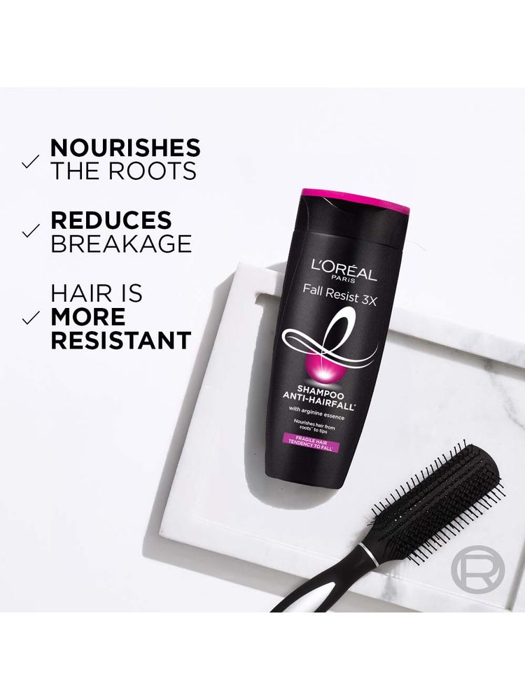 L'Oreal Paris Fall Resist 3x Shampoo is enriched with Arginine to nourish the roots, strengthen hair, and reduce hair fall. This powerful formula reinforces each strand and promotes stronger, healthier hair with every wash.