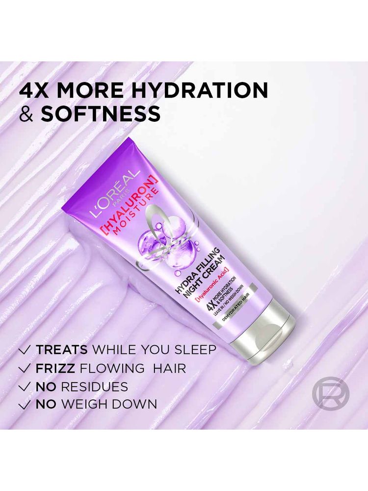 L'Oreal Paris Hyaluron Moisture Leave-In Night Cream is a deeply hydrating overnight treatment for dry, frizzy hair. Powered by hyaluronic acid, this leave-in cream penetrates the hair shaft to restore lost moisture while you sleep. Wake up to soft, frizz-free, and manageable hair every morning—no rinse needed.