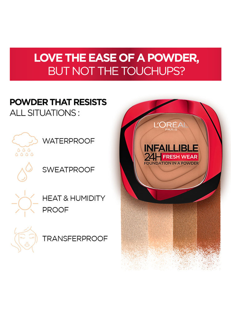 Achieve a flawless matte finish with the L'Oreal Paris Infallible Fresh Wear Powder Foundation. This innovative powder offers the coverage of a liquid foundation with the lightweight feel of a powder. Formulated to resist sweat, heat, and humidity, it delivers up to 24 hours of comfortable wear. It blurs imperfections, evens out skin tone, and controls shine—without drying out your skin. Ideal for on-the-go touch-ups or full-face application, it's your perfect companion for a long-lasting, airbrushed look.