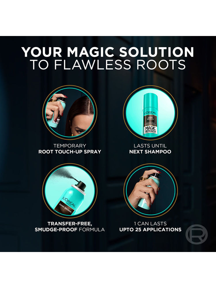 Say goodbye to visible greys with the L'Oreal Paris Magic Retouch Instant Root Concealer. Perfect for in-between salon visits, this lightweight spray covers greys in just seconds and blends effortlessly with your natural hair color. Its quick-dry formula offers an even, transfer-proof finish that stays put until your next shampoo. The pinpoint micro-diffuser ensures precise and mess-free application with no sticky residue. Compact and travel-friendly, it's your go-to solution for emergency touch-ups, whether at home or on the move. Suitable for all hair types and textures, this root concealer delivers salon-like coverage at your fingertips—without any commitment or damage.