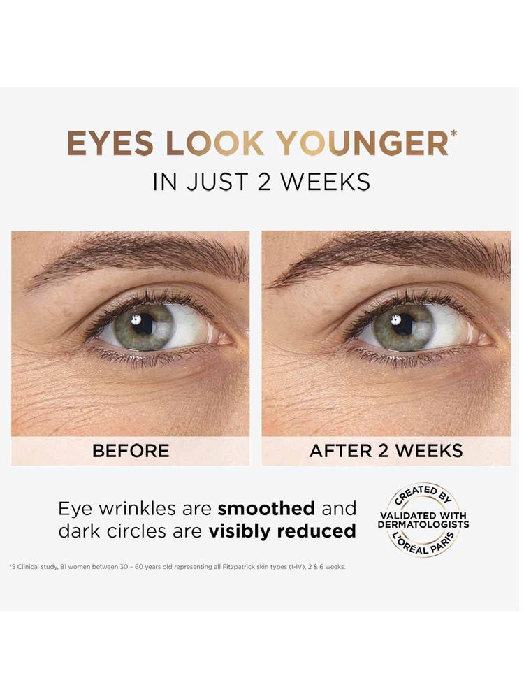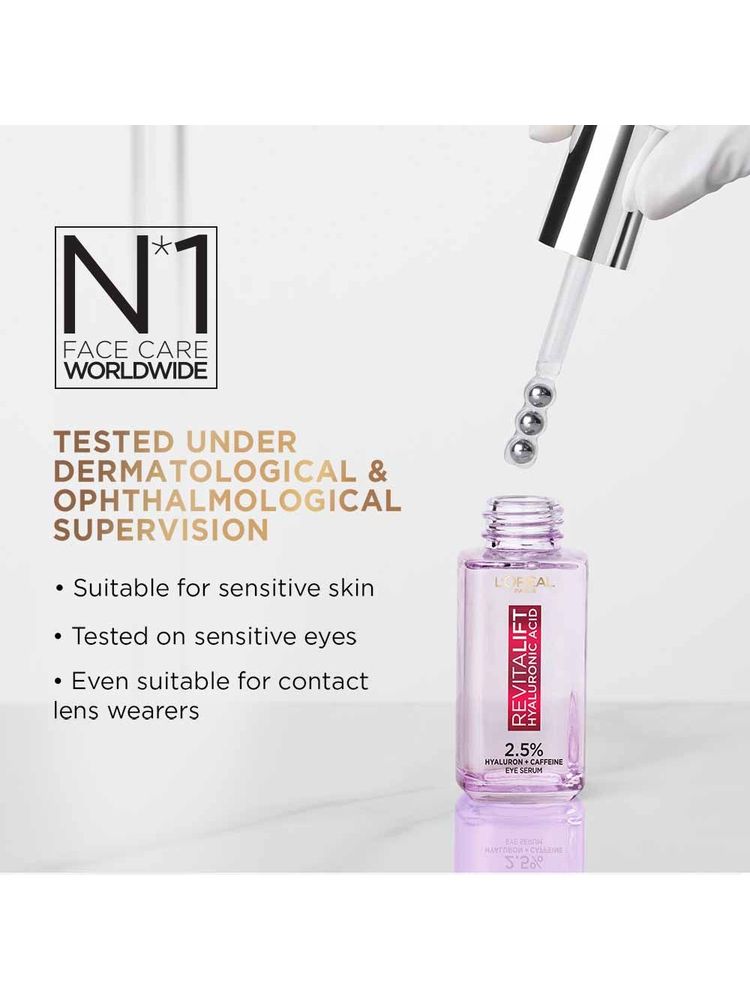 Give your under-eyes the hydration they deserve with L'Oreal Paris Revitalift Eye Serum. Powered by 2.5% Hyaluronic Acid and Caffeine, this dermatologist-tested serum reduces dark circles, puffiness, and fine lines for a refreshed, awake look. Its triple roller metal applicator offers a cooling massage that boosts microcirculation and helps depuff the eye area. The fast-absorbing, non-sticky formula deeply hydrates while visibly firming and brightening the delicate skin around the eyes. Perfect for daily use, morning and night, this serum works well under makeup and suits all skin types.