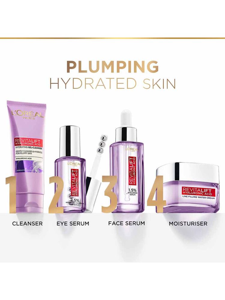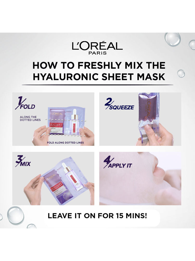 L'Oreal Paris Revitalift Hyaluronic Acid Fresh Mix Serum Sheet Mask delivers intense hydration in one use. Just fold and mix the fresh hyaluronic serum into the mask before applying to deeply moisturize and plump up dry, tired skin.