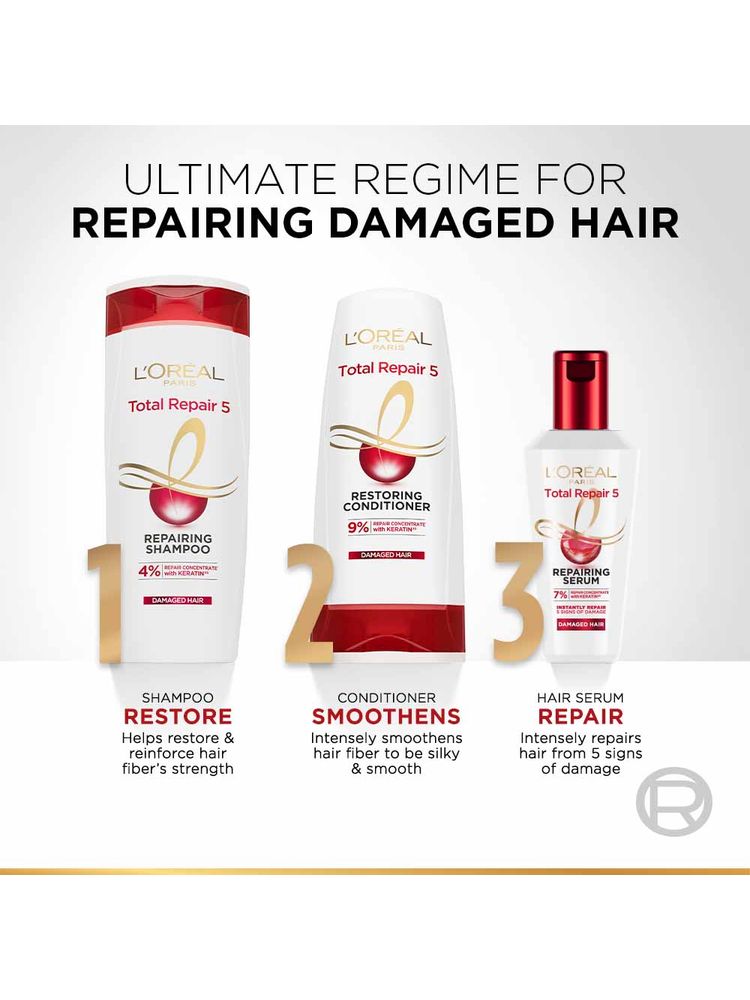 L'Oreal Paris Total Repair 5 Combo combines a damage-repairing shampoo and conditioner to fight the five signs of hair damage: hair fall, dryness, roughness, dullness, and split ends. A complete solution for damaged hair.