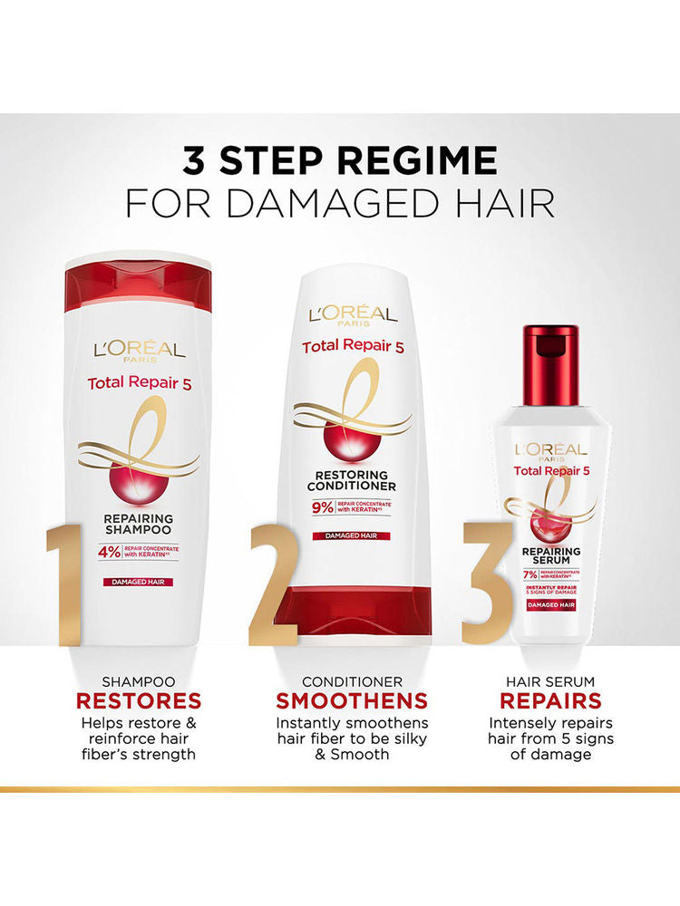 L'Oreal Paris Total Repair 5 Serum is a leave-in treatment designed to repair and protect damaged hair. Infused with Keratin XS, it smoothens hair instantly, controls frizz, and reduces split ends for stronger, healthier-looking hair.