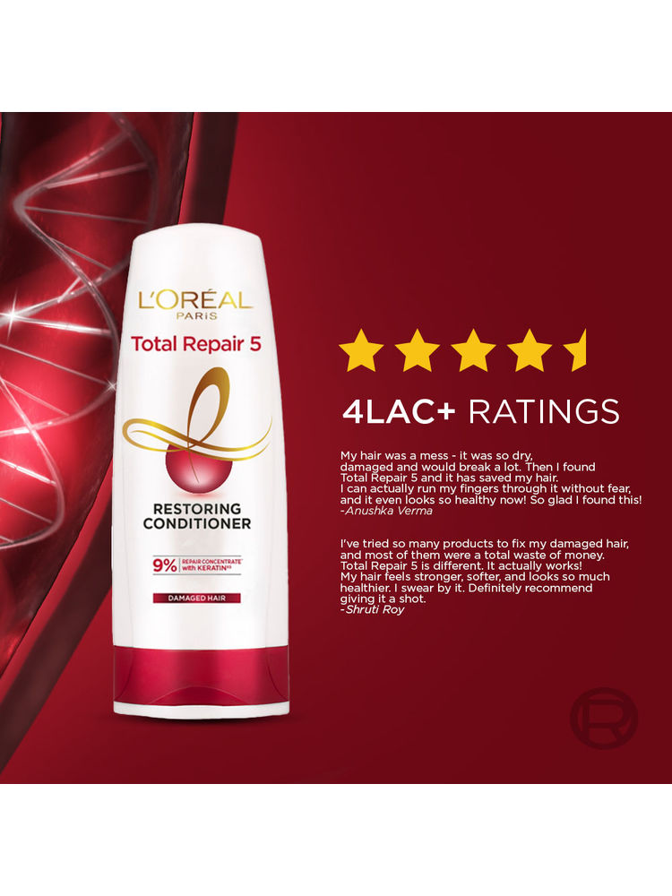 L'Oreal Paris Total Repair 5 Restoring Conditioner fights five signs of hair damage — hair fall, dryness, roughness, dullness, and split ends. Infused with Keratin XS, it restores strength, moisture, and shine for healthy-looking hair.